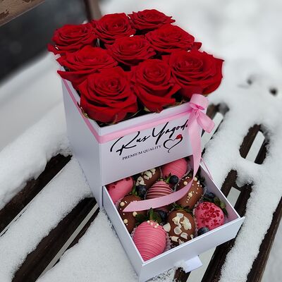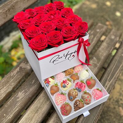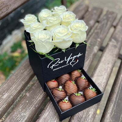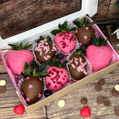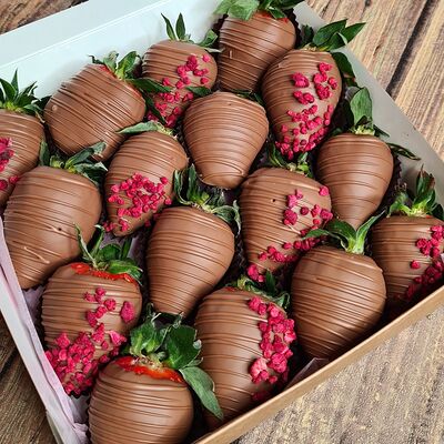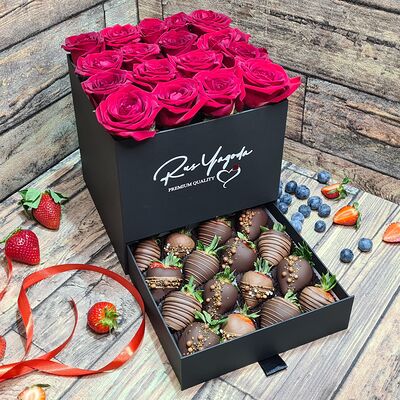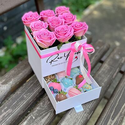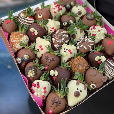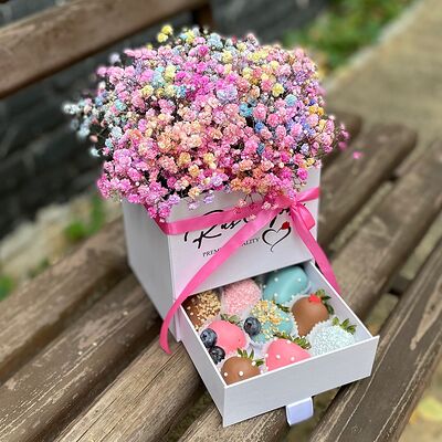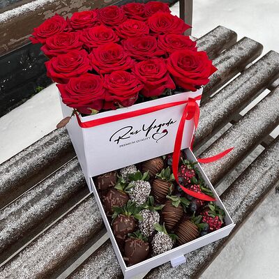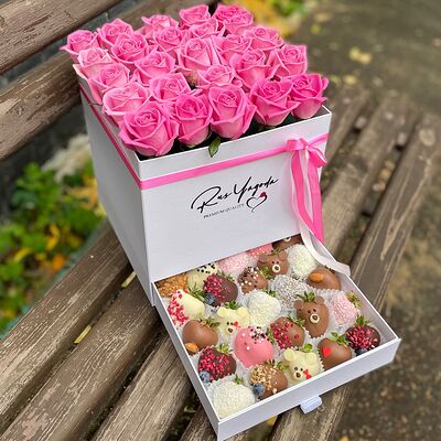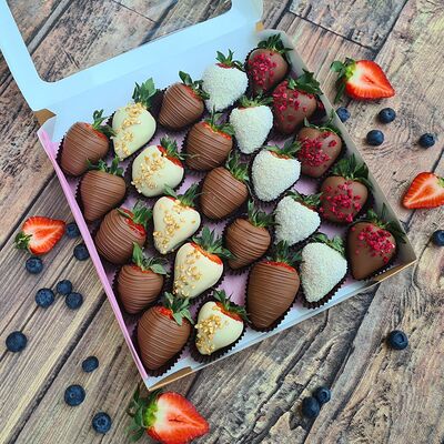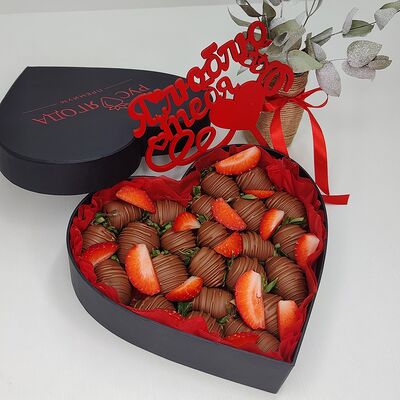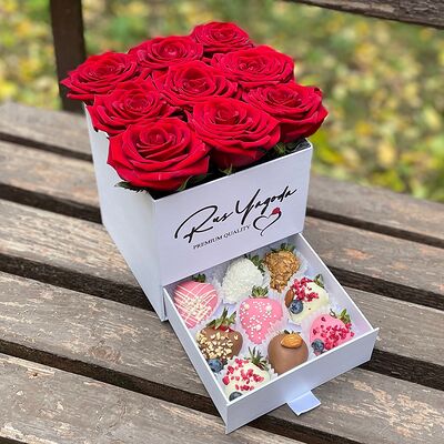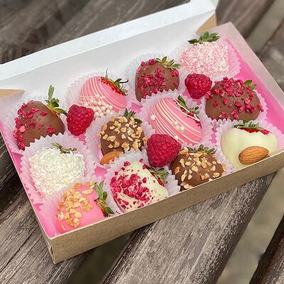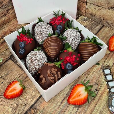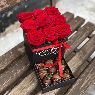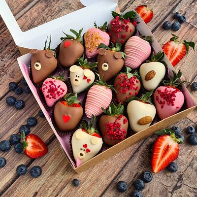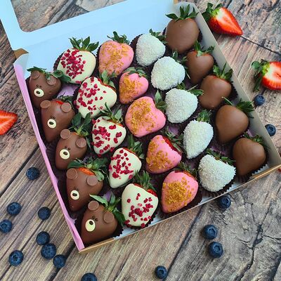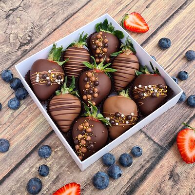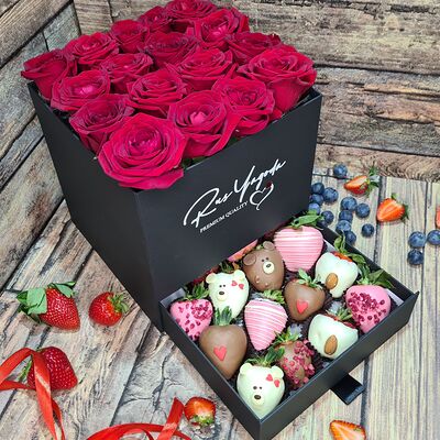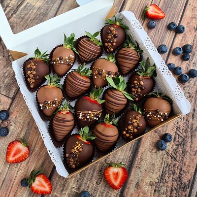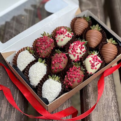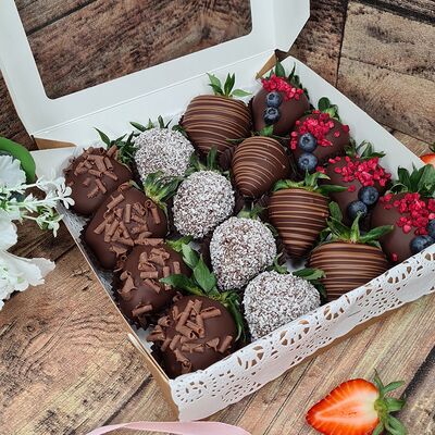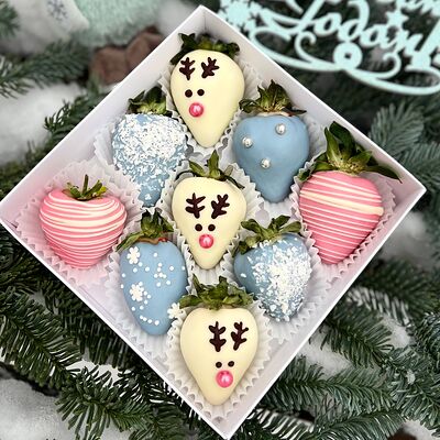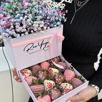 Клубника в бельгийском шоколаде, голубика, малина (30х30 см). Распечатаем текст вашего поздравления на открытке. Композиция будет упакована в прозрачную пленку для защиты при транспортировке