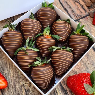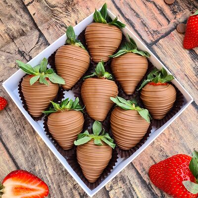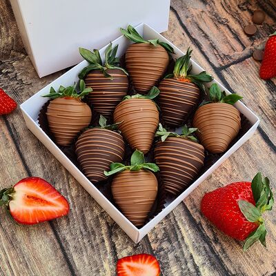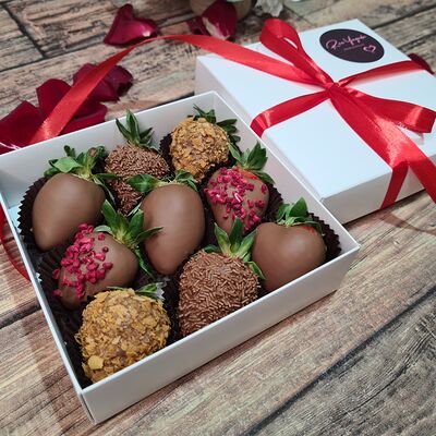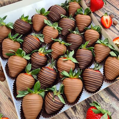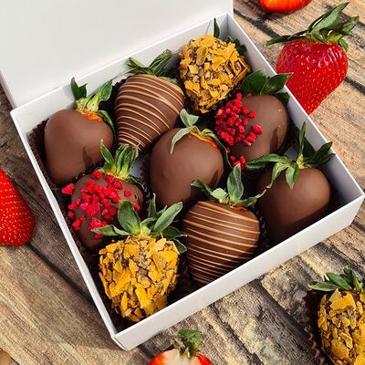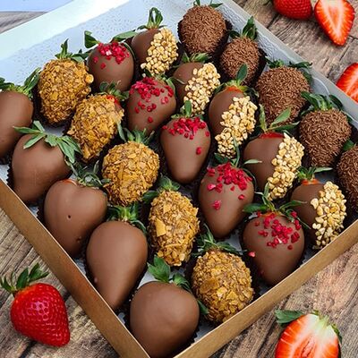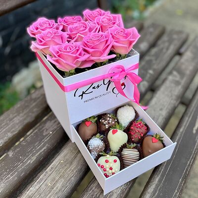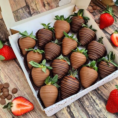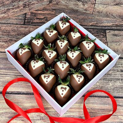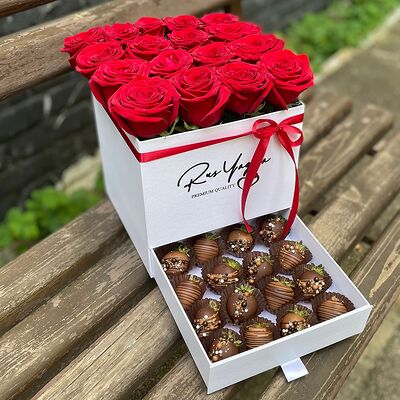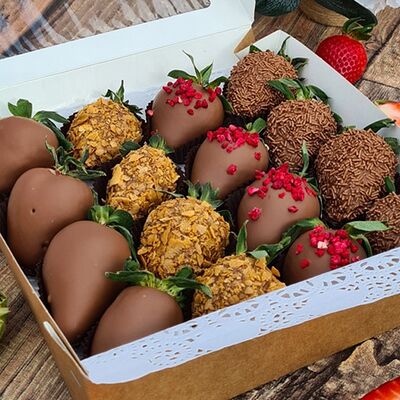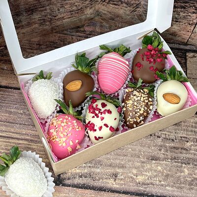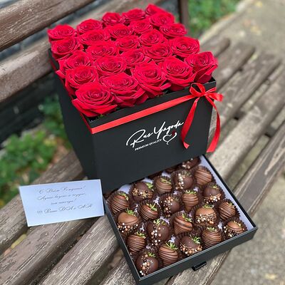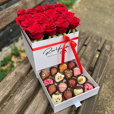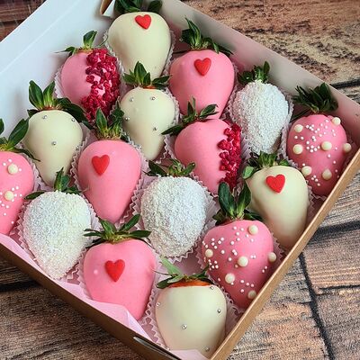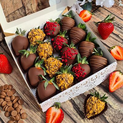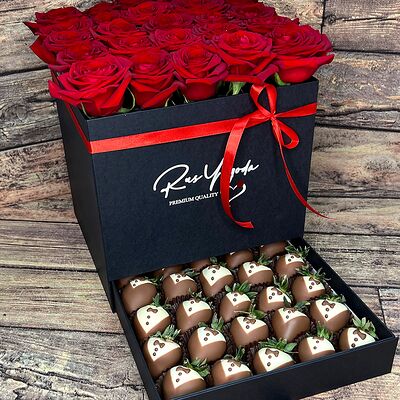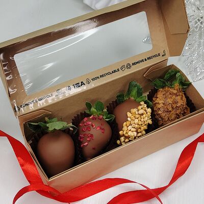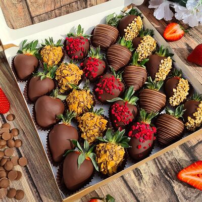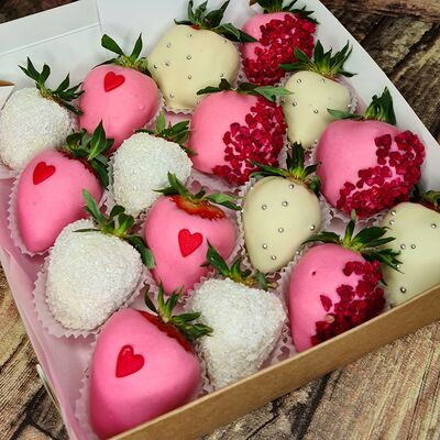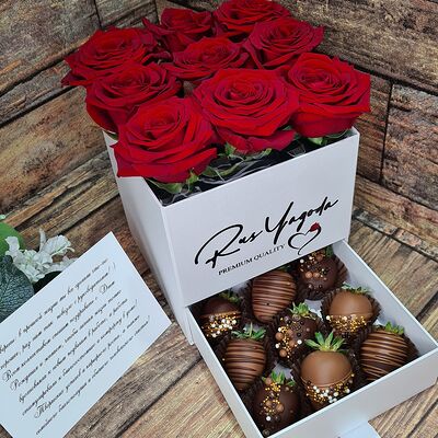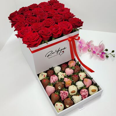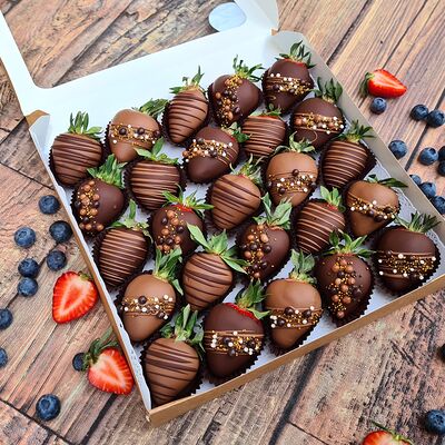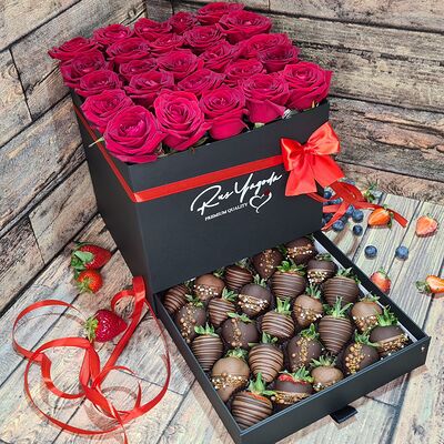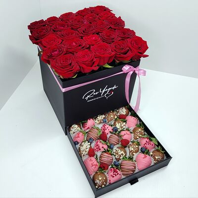 Клубника в бельгийском шоколаде, голубика, малина (30х30 см). Распечатаем текст вашего поздравления на открытке. Композиция будет упакована в прозрачную пленку для защиты при транспортировке