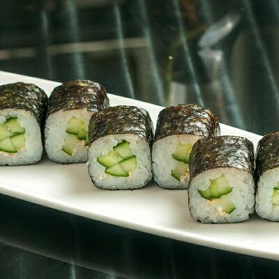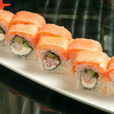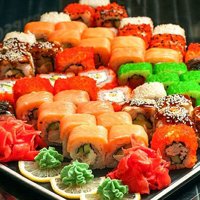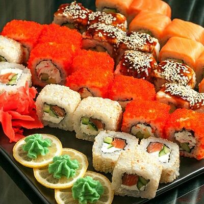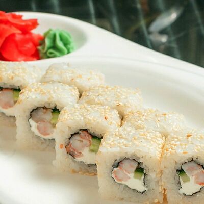 Рис, лосось, огурец, креветка, сыр сливочный, имбирь красный, васаби, соус соевый