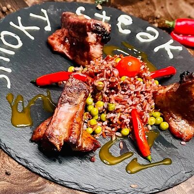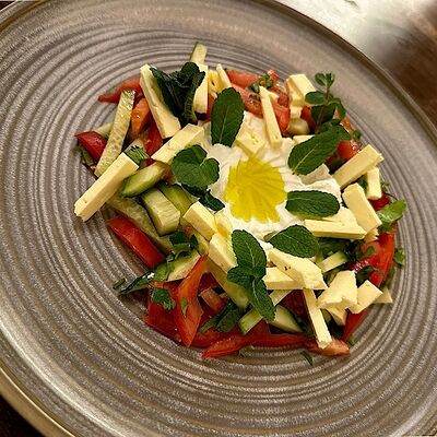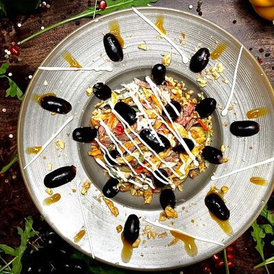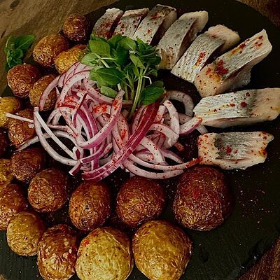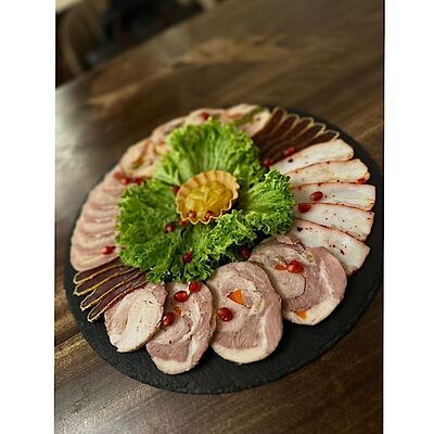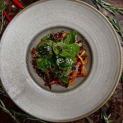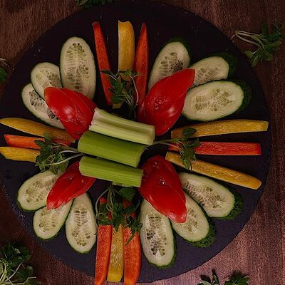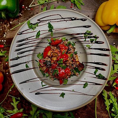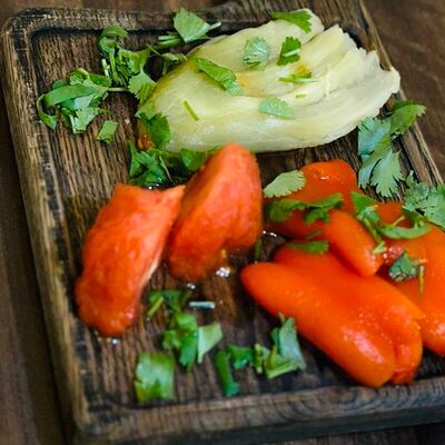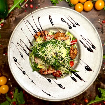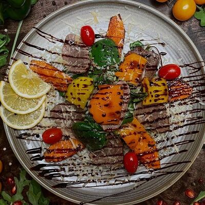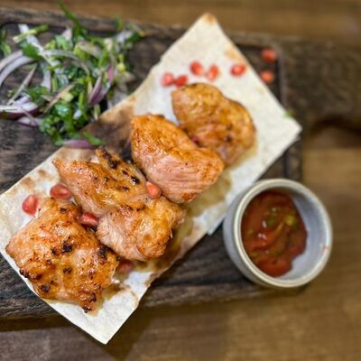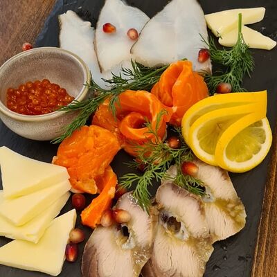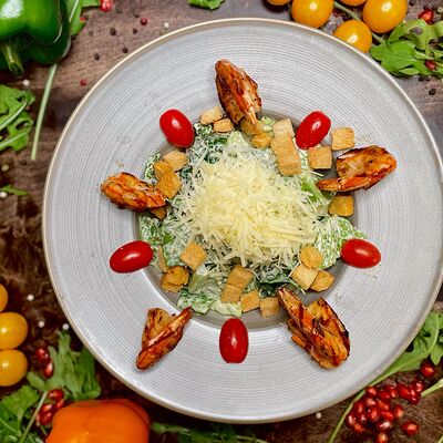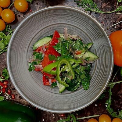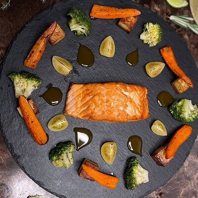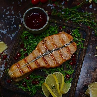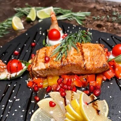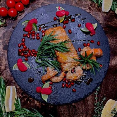 Семга, креветки, помидоры черри, овощная подушка, красное вино, гранат, соль, специи