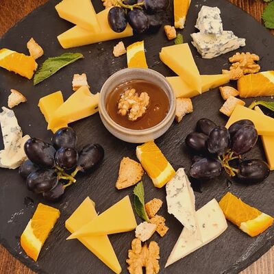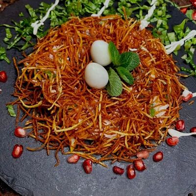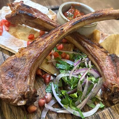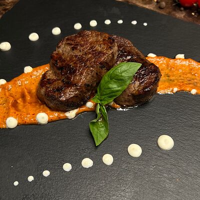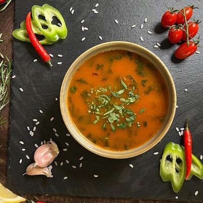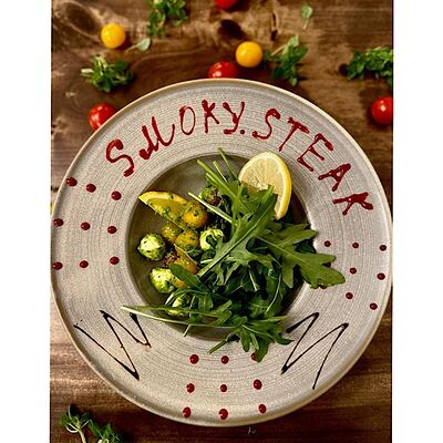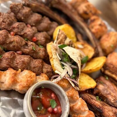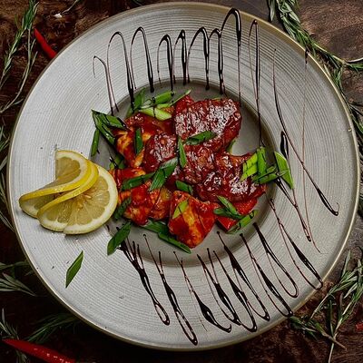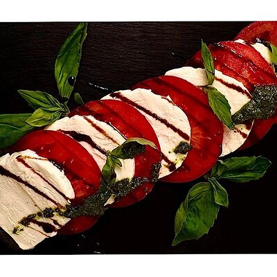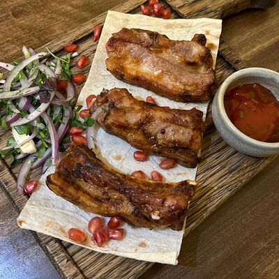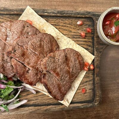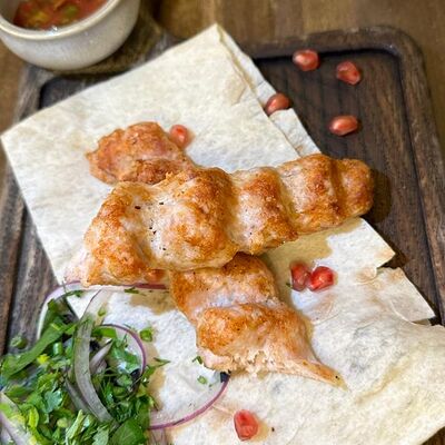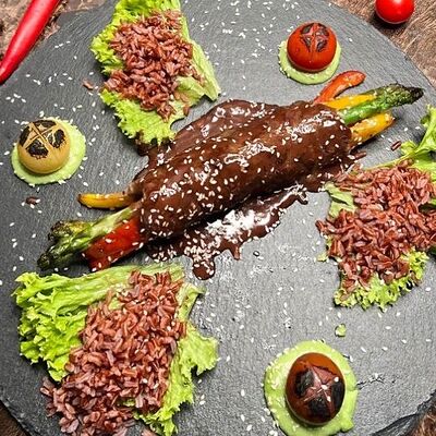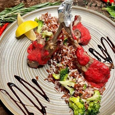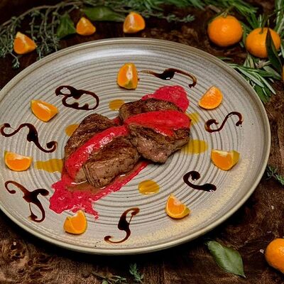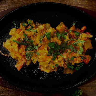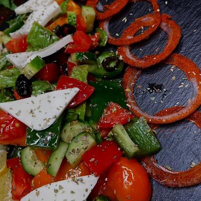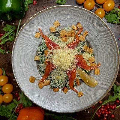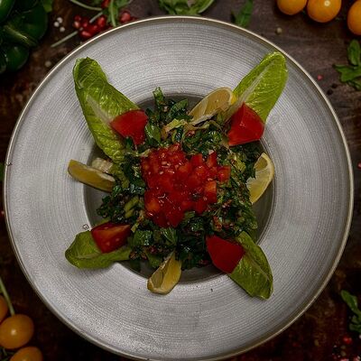 Семга, креветки, помидоры черри, овощная подушка, красное вино, гранат, соль, специи