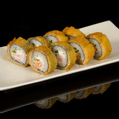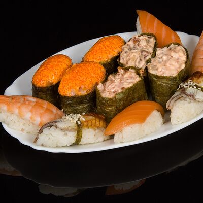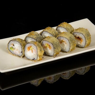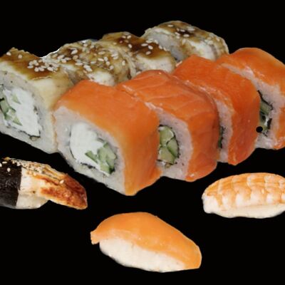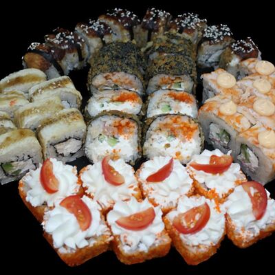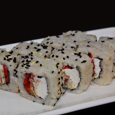 Икра масаго, крабовый замес, угорь, огурец, сыр творожный, томаты черри, имбирь маринованный (10 г), васаби (3 г)