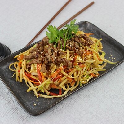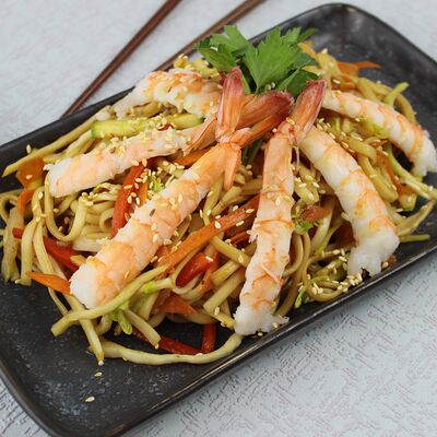 Стеклянная лапша с овощами, морской кальмар, мидии, осьминог, соус устричный, кунжут
