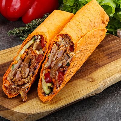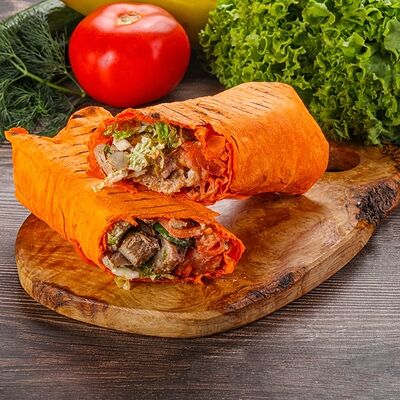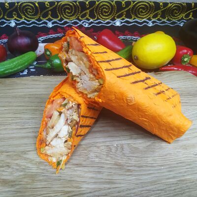 Лаваш сырный, курица, пекинская капуста, помидоры, огурцы, морковь по-корейски, лук, чесночный соус, томатный соус