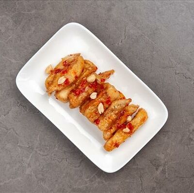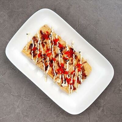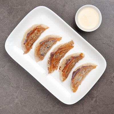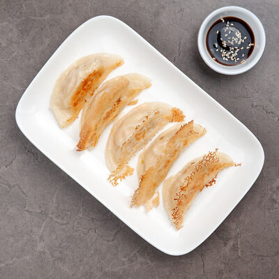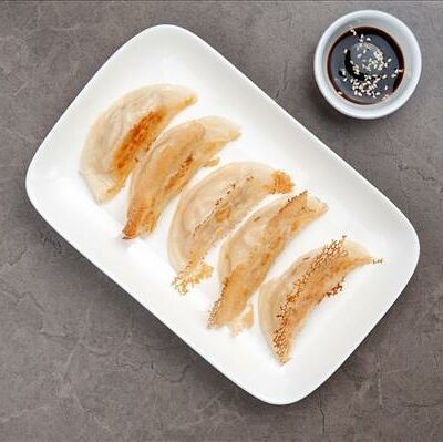 Свинина, пекинская капуста, лук, чеснок, имбирь, пшеничное тесто. Гёдза - классические японские пельмени, приготовленные на пару, а затем обжаренные до хрустящей корочки. Отдельно подаётся соевый соус с кунжутом