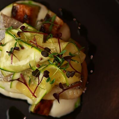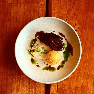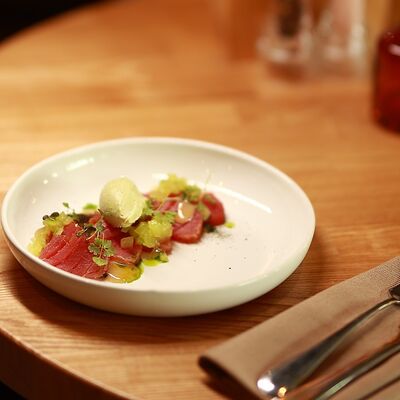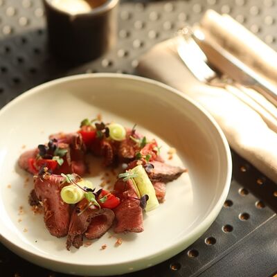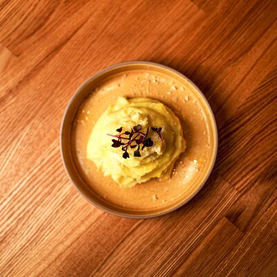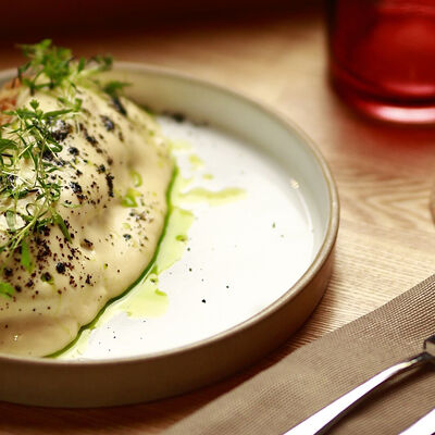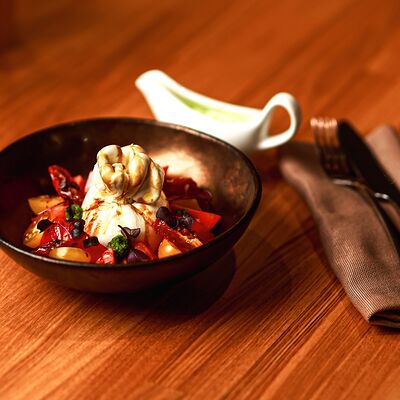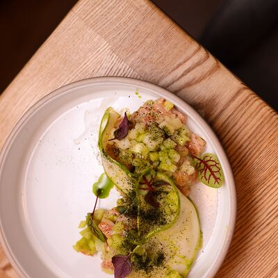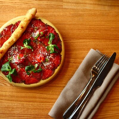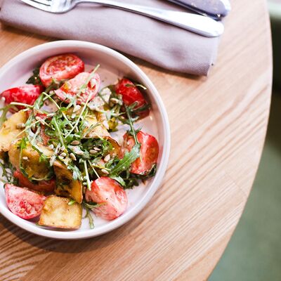 Нежный сыр буррата с розовыми узбекскими томатами, черри и домашним бальзамиком. Подаётся с соусом из сливок и зелёного масла