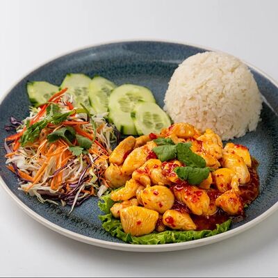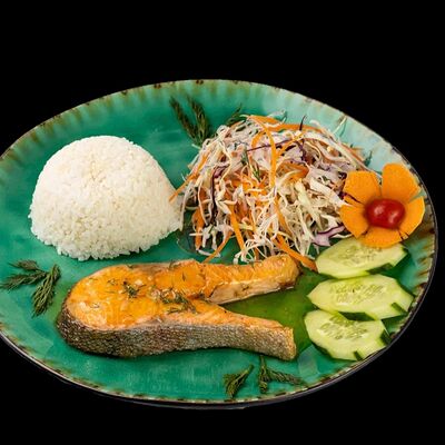 Рис с зеленью и лососем, прожаренным в апельсиновом соусе
