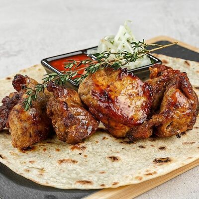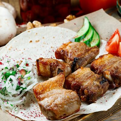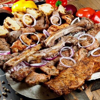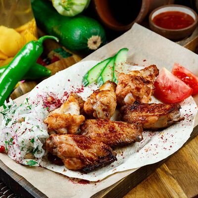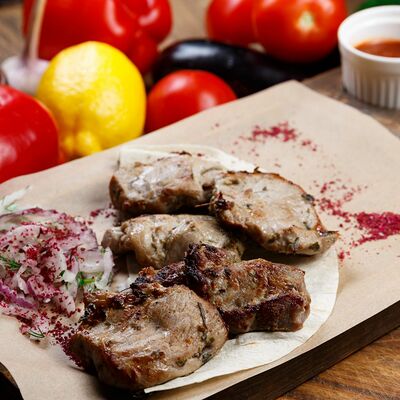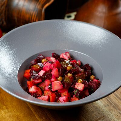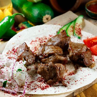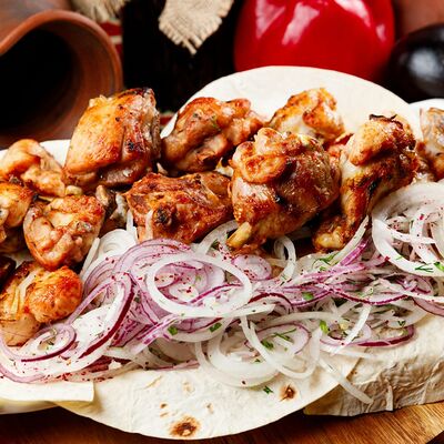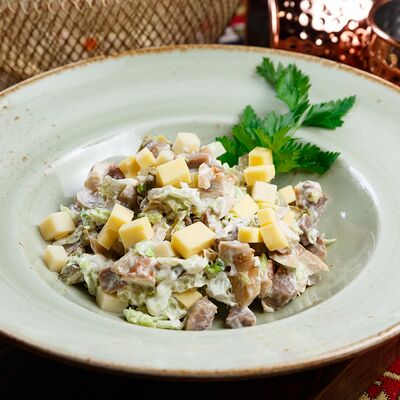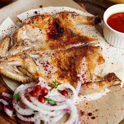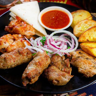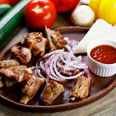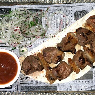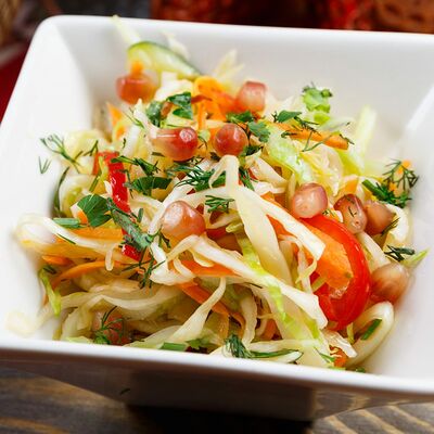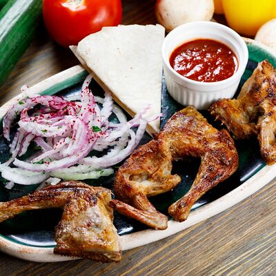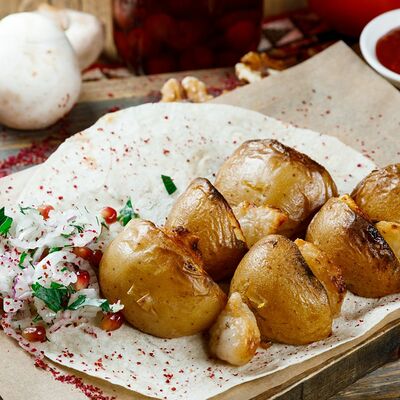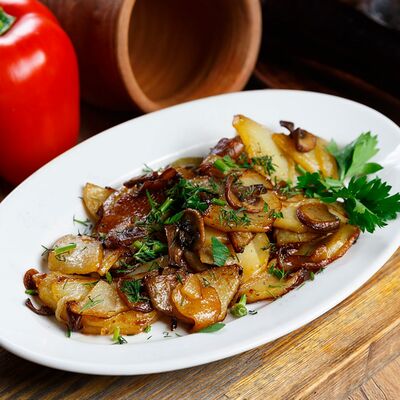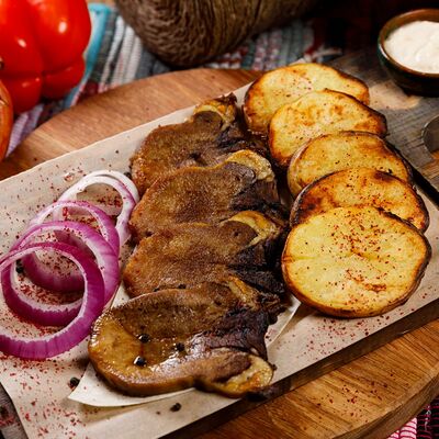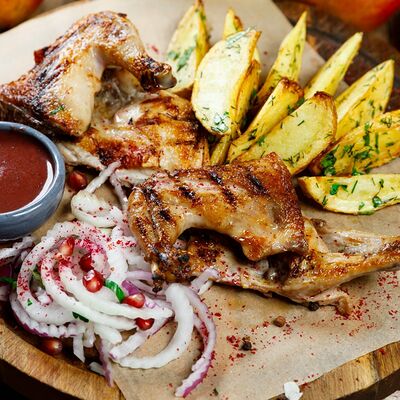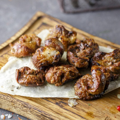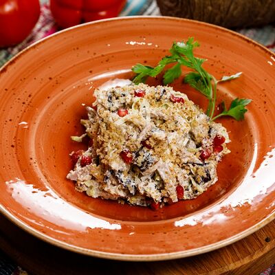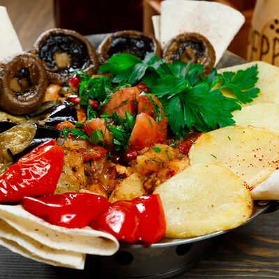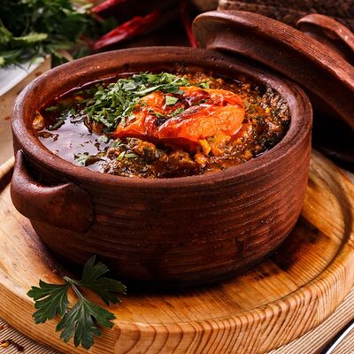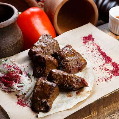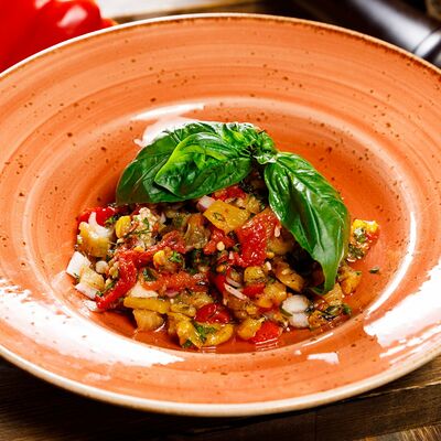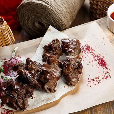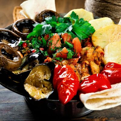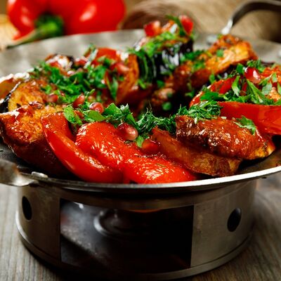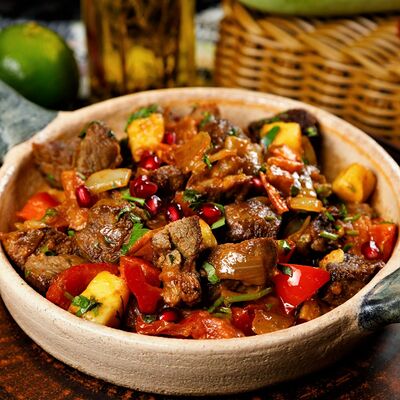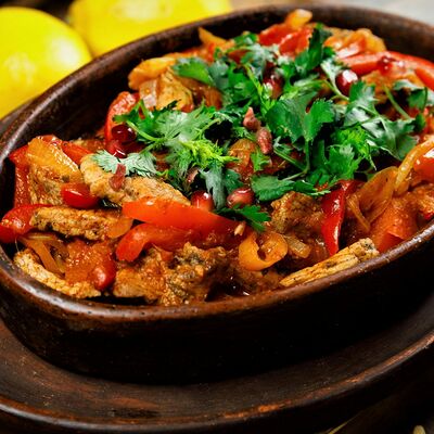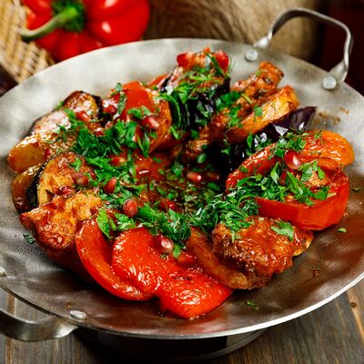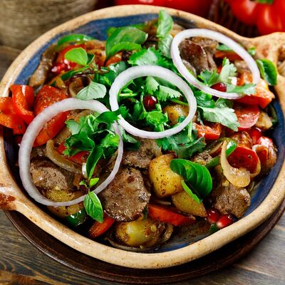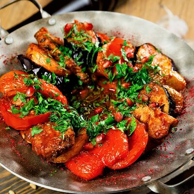 Печень курицы тушеная с овощами, репчатым луком, картофелем, томатной пастой и зернами граната. Объедение