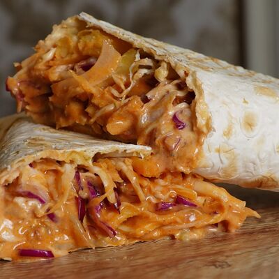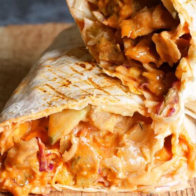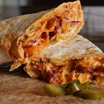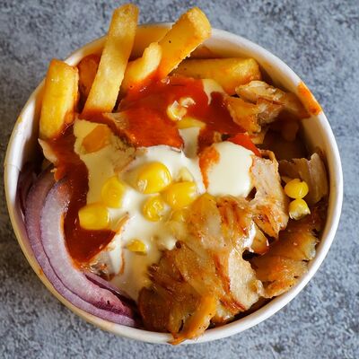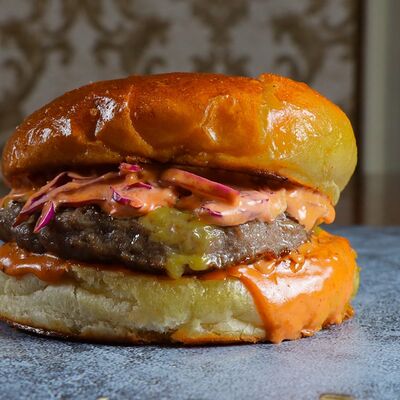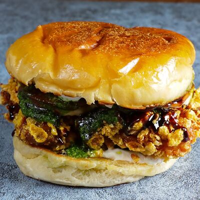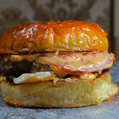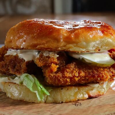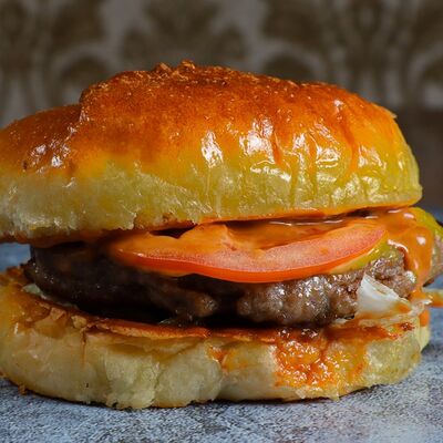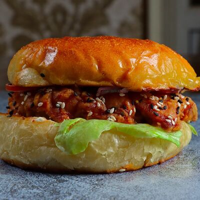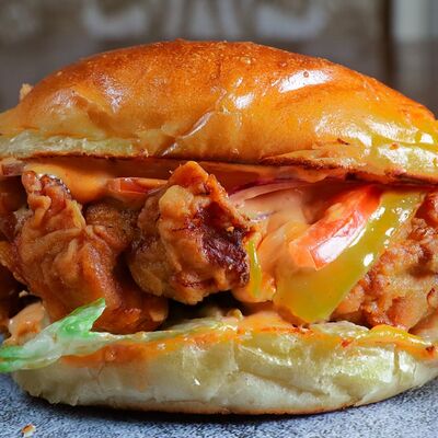 Курица, сыр, соус, помидор, лук, салат айсберг, фирменная булочка