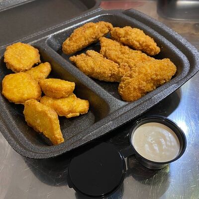 Хрустящие наггетсы (6 шт.) и хрустящие стрипсы (5 шт.) и фирменный соус