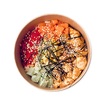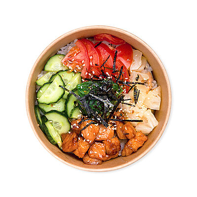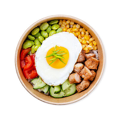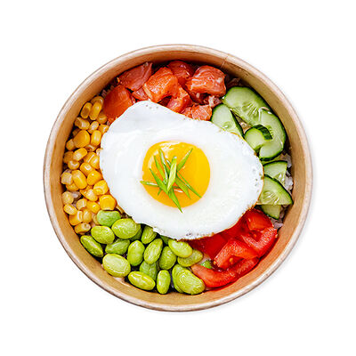 Изысканный ролл с воздушным омлетом, сливочным сыром, свежими листьями салата и помидором, покрытый ароматным соусом боул и хрустящим жареным луком