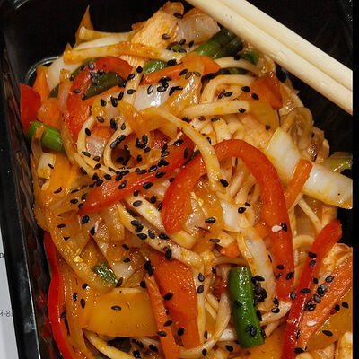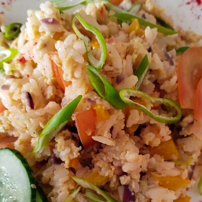 Рис, помидор, перец болгарский, лук красный, чеснок, лук порей, яйца, соус острый