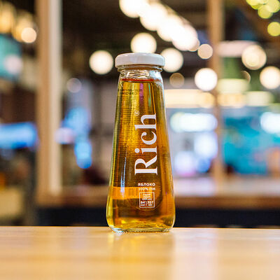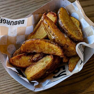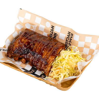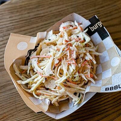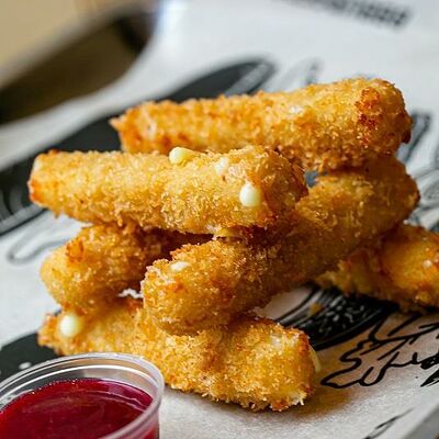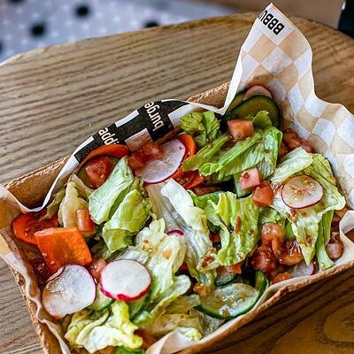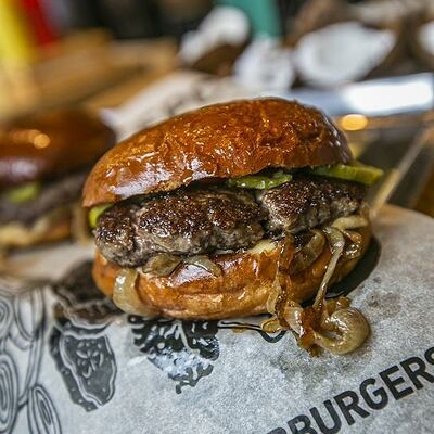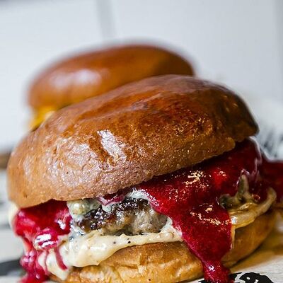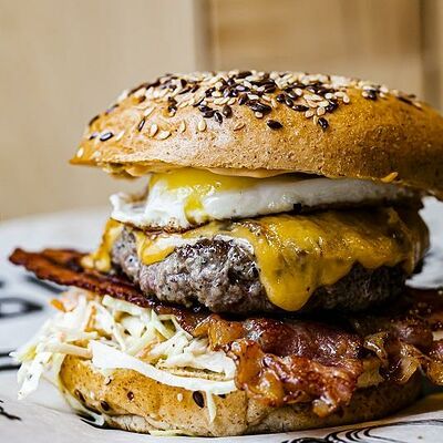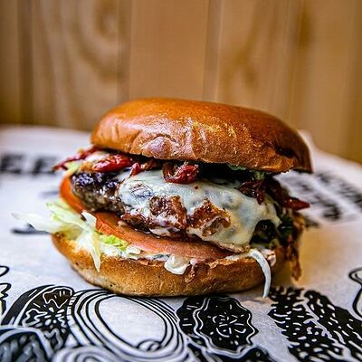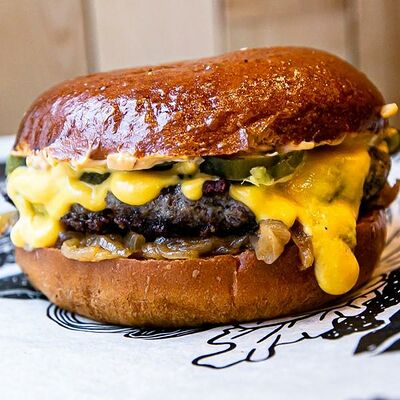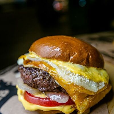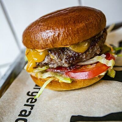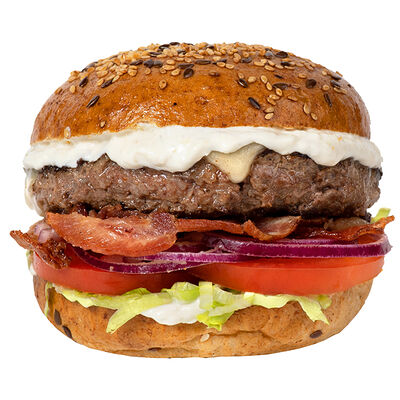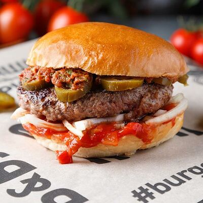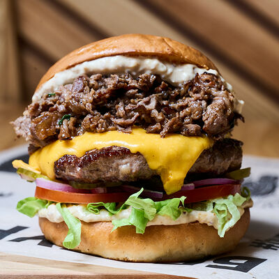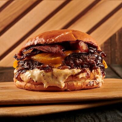 Булочка бриошь, котлета говяжья, маринованная рубленая говядина, салат айсберг, лук репка, огурцы маринованные, помидоры, сыр чеддер, соус горчичный