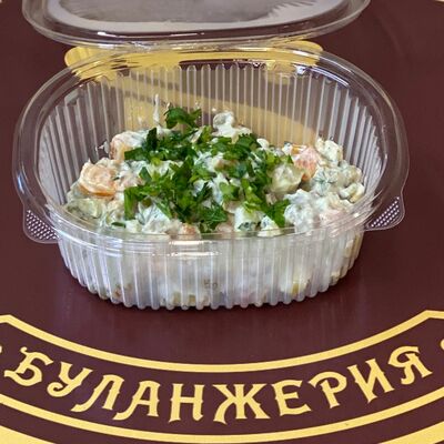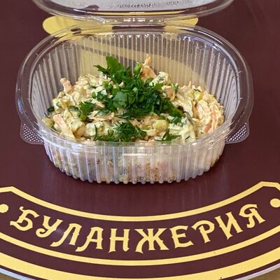 Морковь, кукуруза, куриная грудка, грецкий орех, сметана и майонез, соль, черный перец, петрушка, укроп