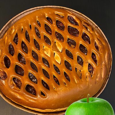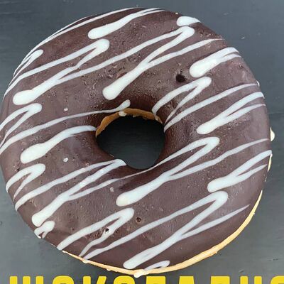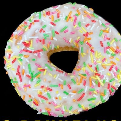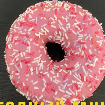 Сдобный пончик из пшеничной муки с начинкой из ягодного конфитюра. Украшен глазурью и кондитерской посыпкой