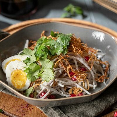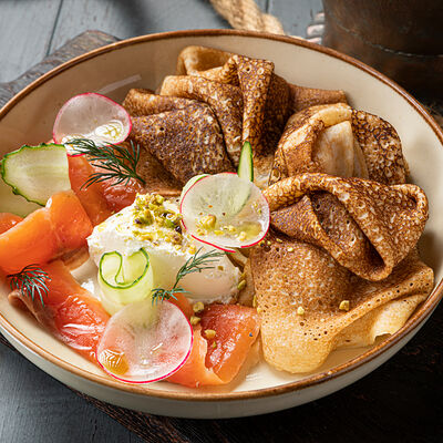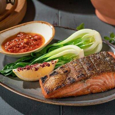 Карельская форель подаётся с соусом карри-манго, лимоном и иранским сумахом