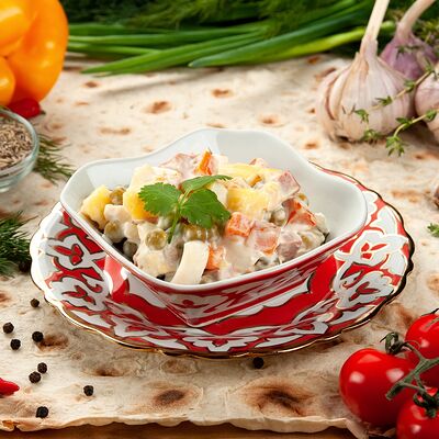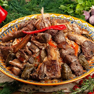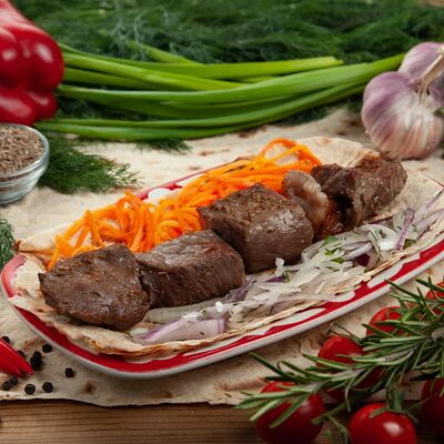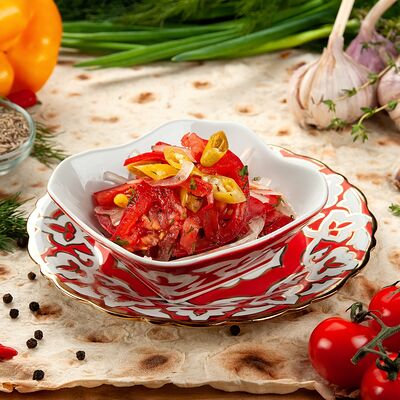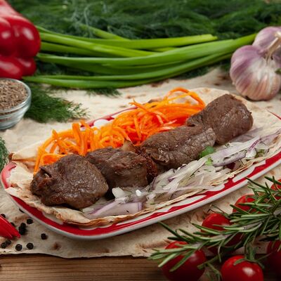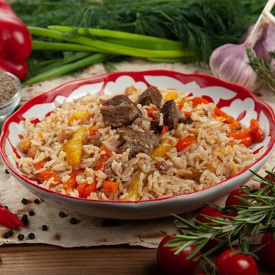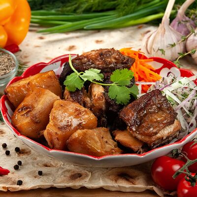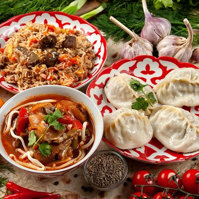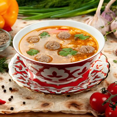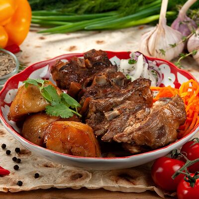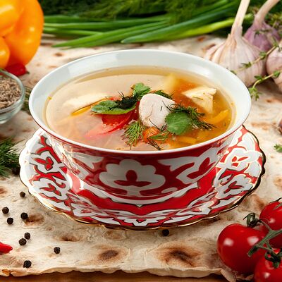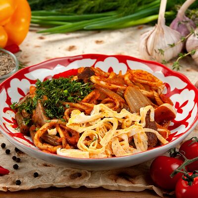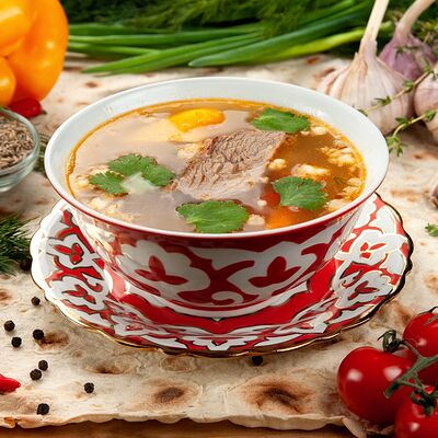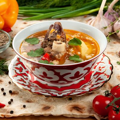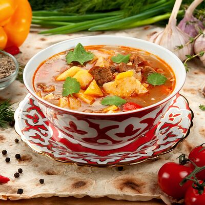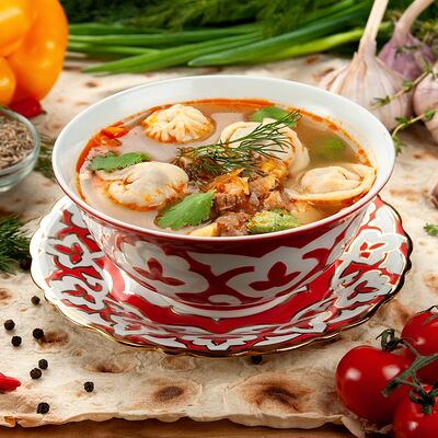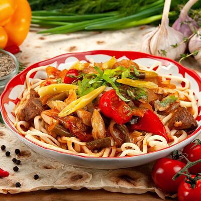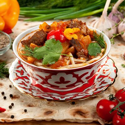 Мякоть говядины, говяжий бульон, китайская капуста, фасоль стручковая, домашняя лапша, лук репчатый, помидоры, стебель сельдерея, перец сладкий, чеснок, соевый соус, бадьян