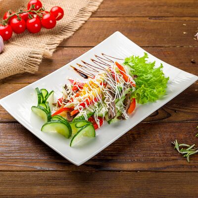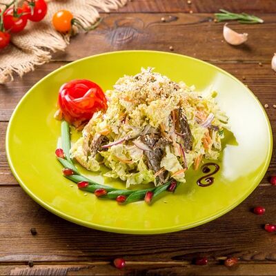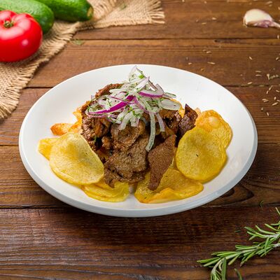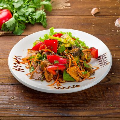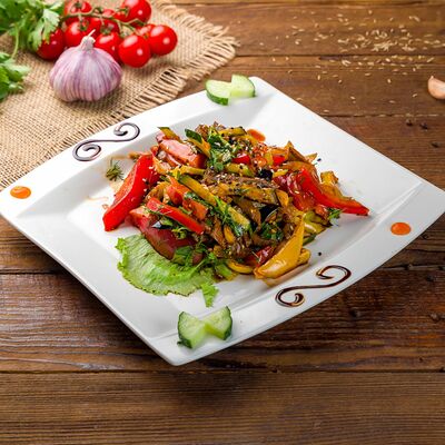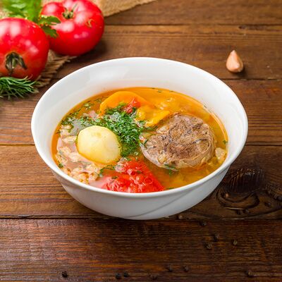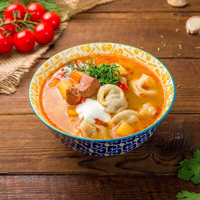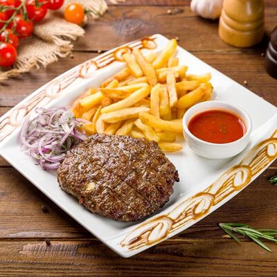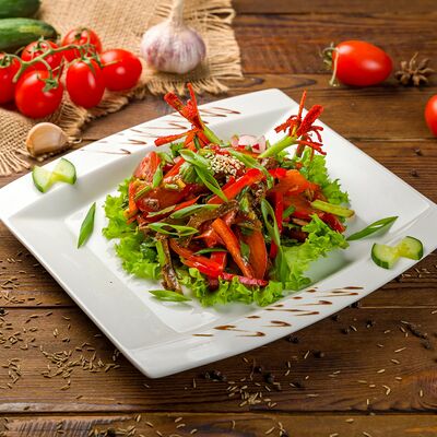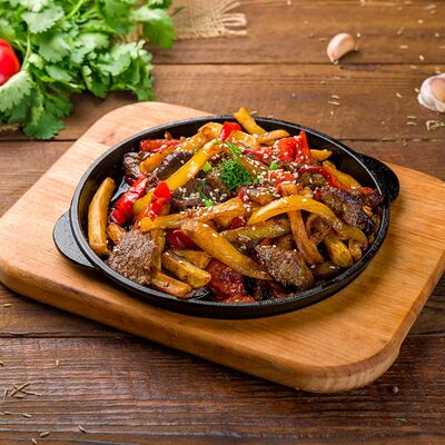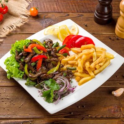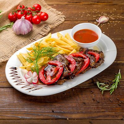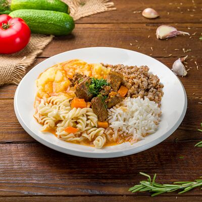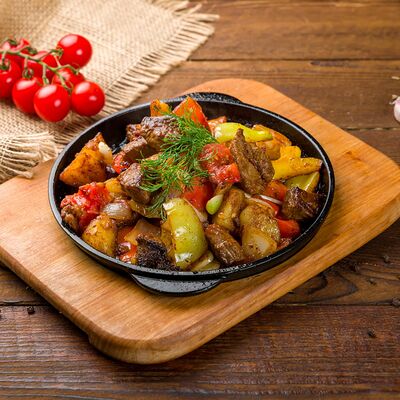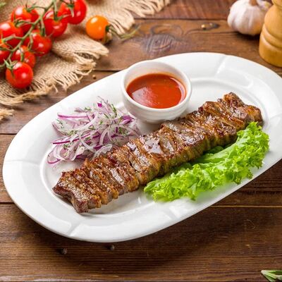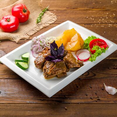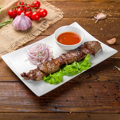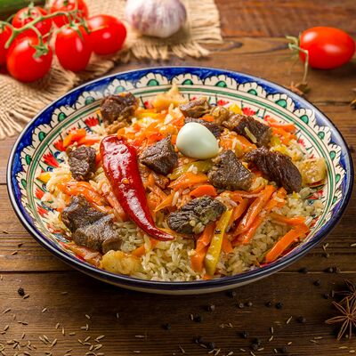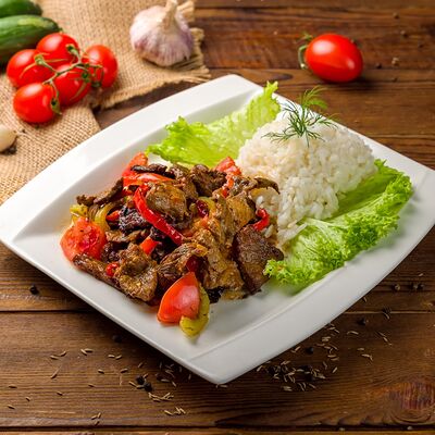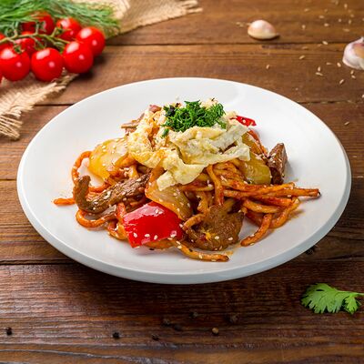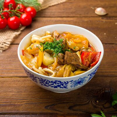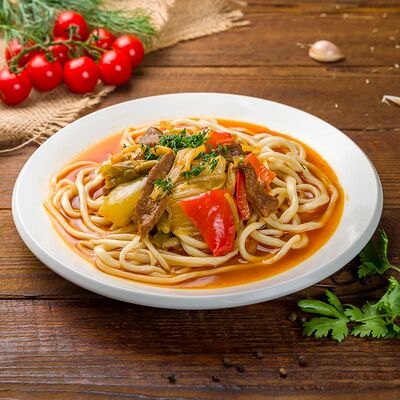 Узбекский лагман: говядина, лапша, картофель, морковь, болгарский перец, помидоры, лук. Люля-кебаб: говядина, лук, соус