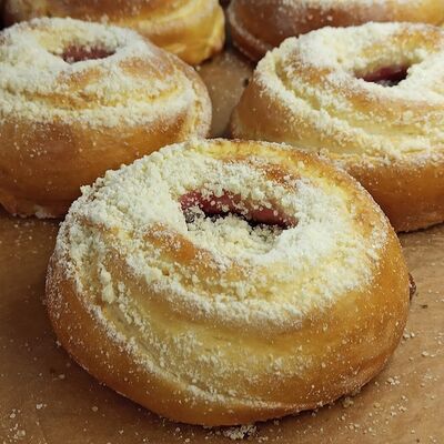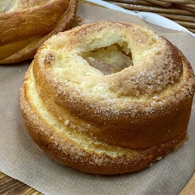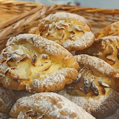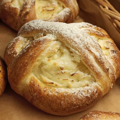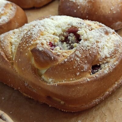 Тесто сдобное дрожжевое (мука высшего сорта, яйцо куриное, вода, растительное масло, сахар, соль, дрожжи), творог, вишня натуральная без косточки, загуститель, сахар, сахарный сироп