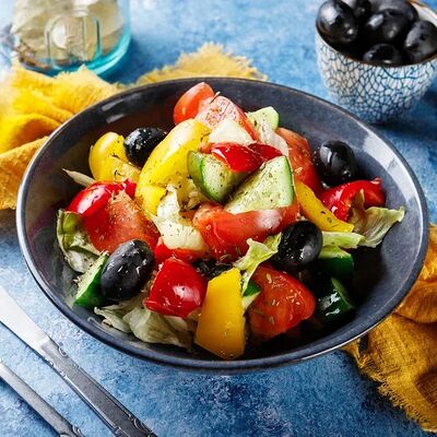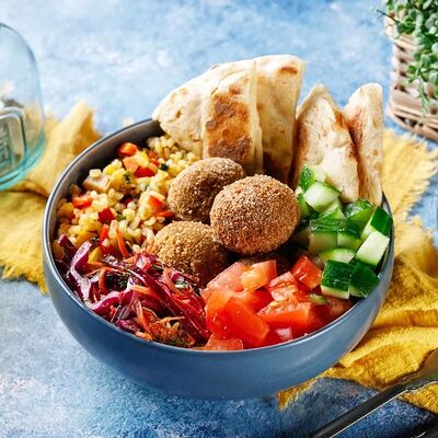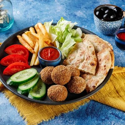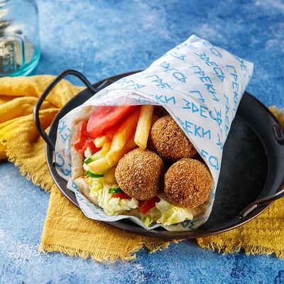 Классический греческий гирос в толстой пите с йогуртовым соусом дзадзики, картофелем фри, свежими огурцами, томатами и салатом айсберг. Размер и начинка на выбор