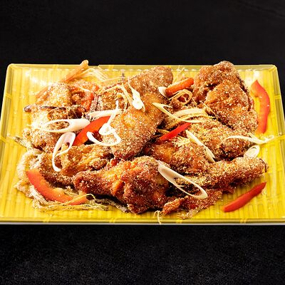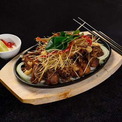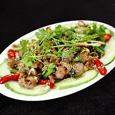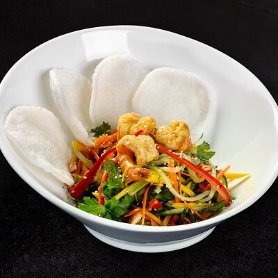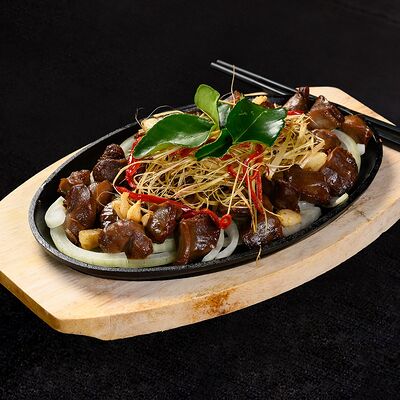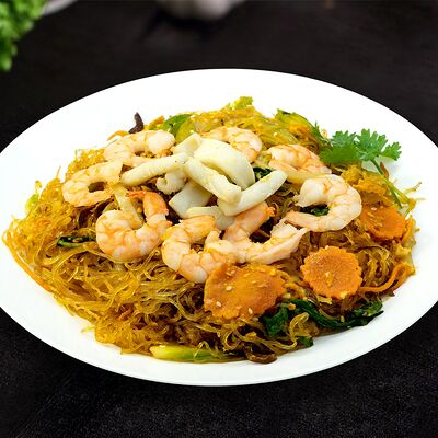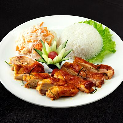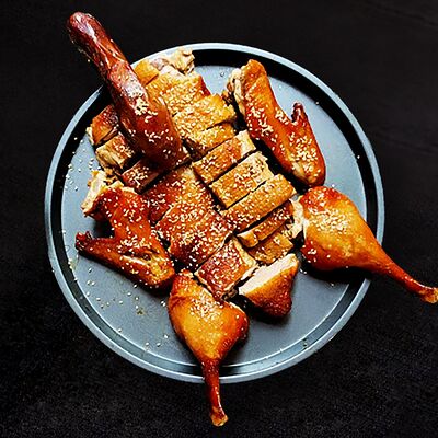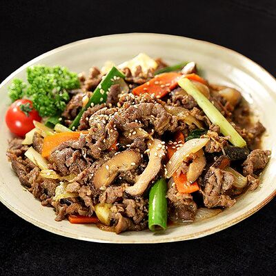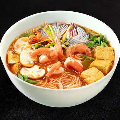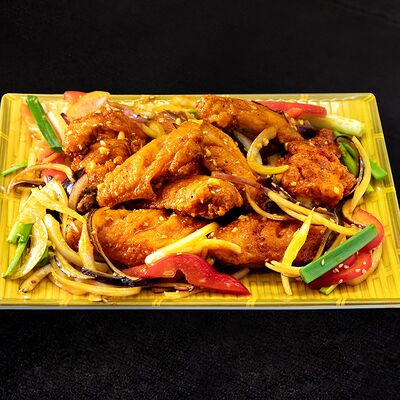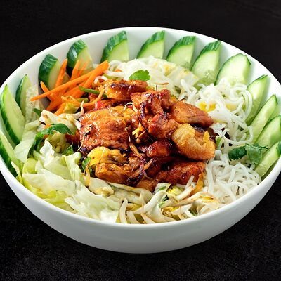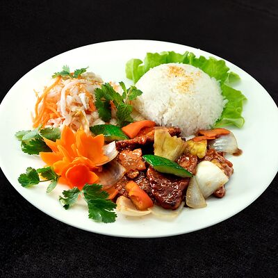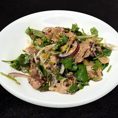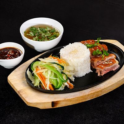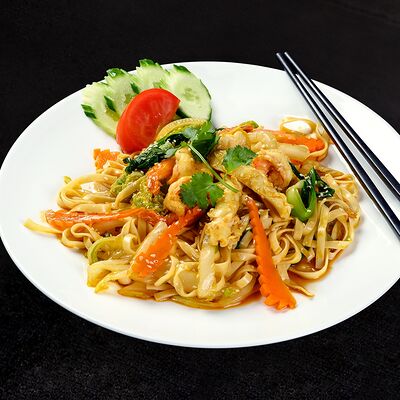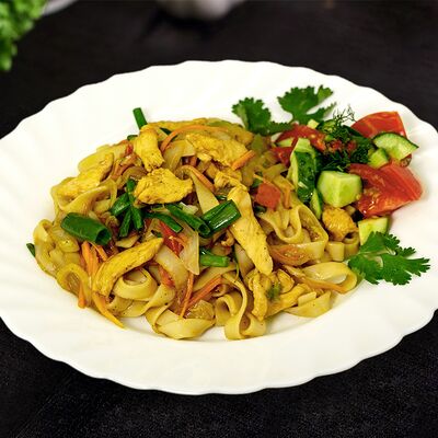 Жареная лапша удон с сезонными овощами, утиной грудкой и соусом