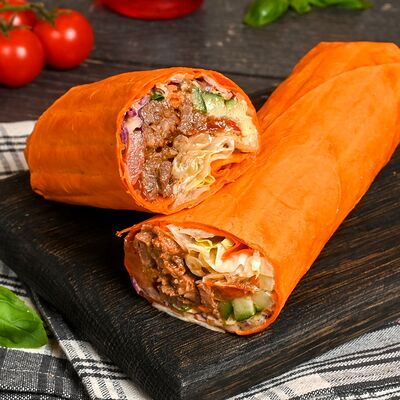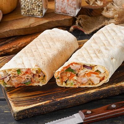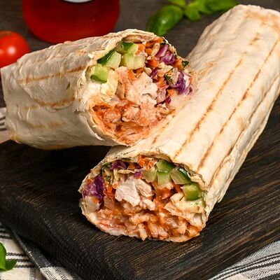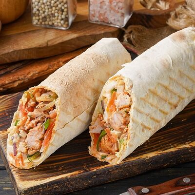 Свежие помидоры, капуста, огурец, халапеньо, курица, чесночный соус, томатный соус, сырный лаваш