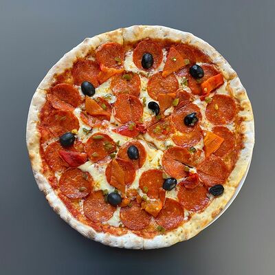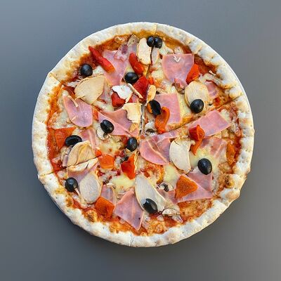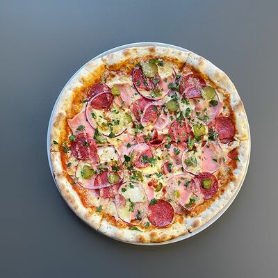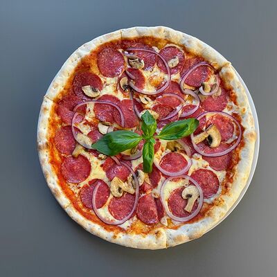 Томатный соус, салями, шампиньоны, моцарелла, красный лук. Тонкое тесто (30 см)