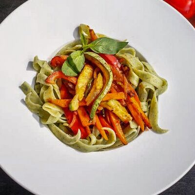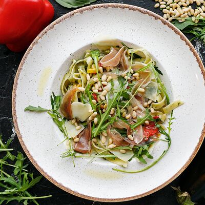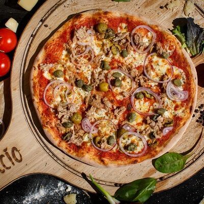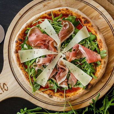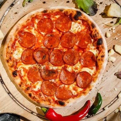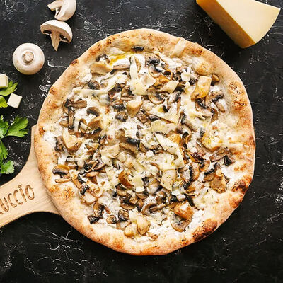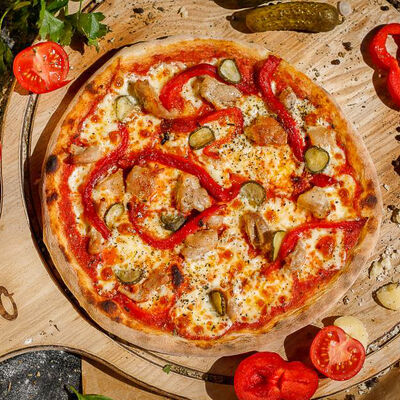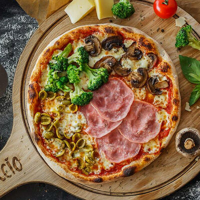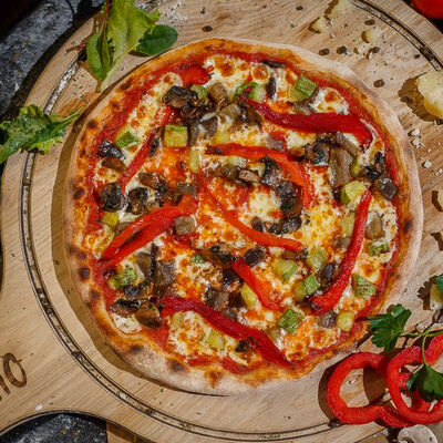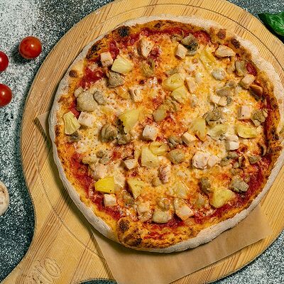 Фирменный томатный соус, моцарелла, ветчина, орегано, свежие томаты, грибы, оливковое масло (32 см)
