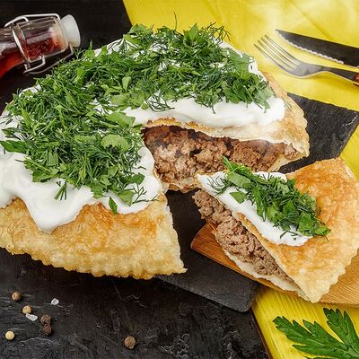 Хрустящее тесто, фарш из мраморной говядины. Хедлайнер нашего меню - сочный чебурек с мраморной говядиной. Мраморная говядина и наваристый сок не оставят равнодушными истинных ценителей мясных чебуреков
