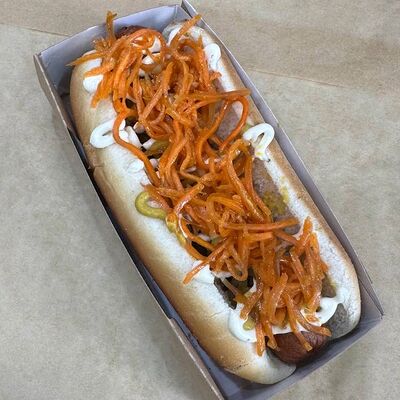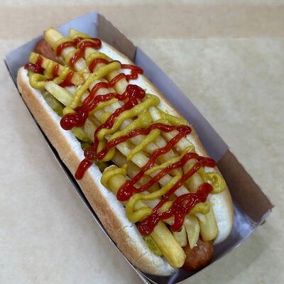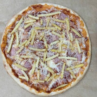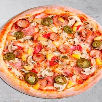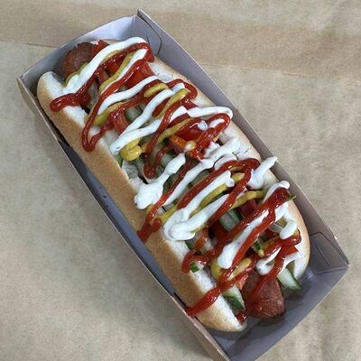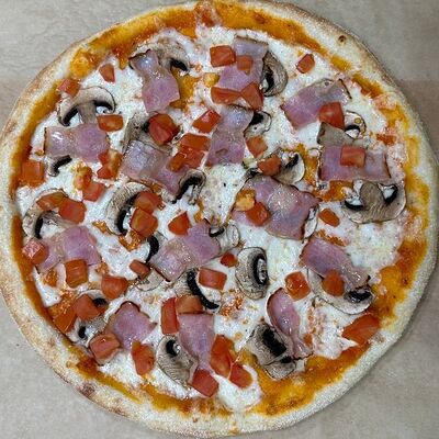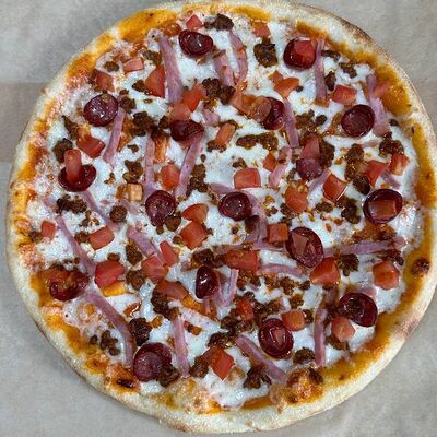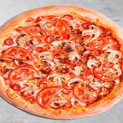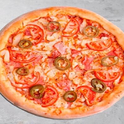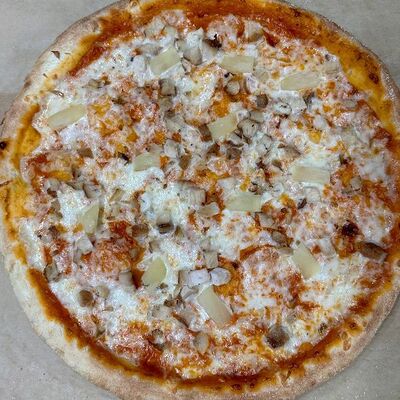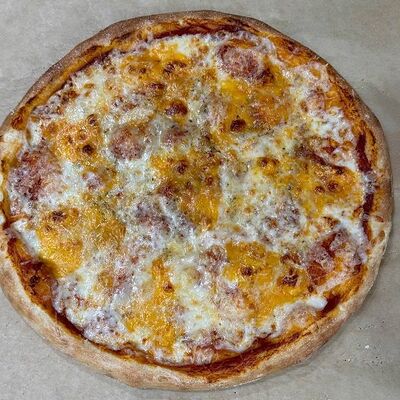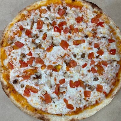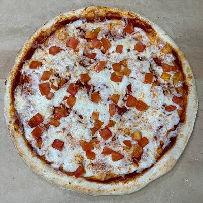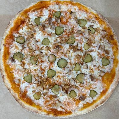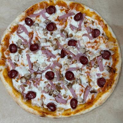 Пицца Четыре сыра (30 см), хот-дог с помидоркой (булочка для хот-дога, сосиска куриная, помидоры свежие, огурцы свежие, соус цезарь, горчица, кетчуп; 2 шт.)