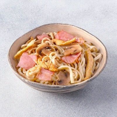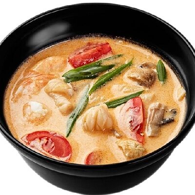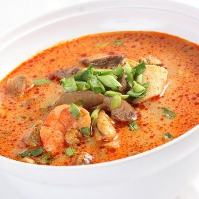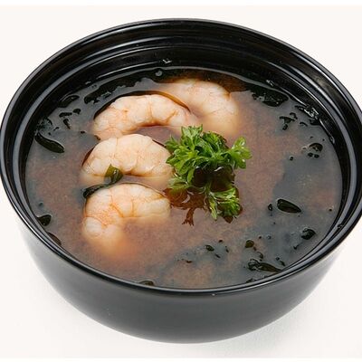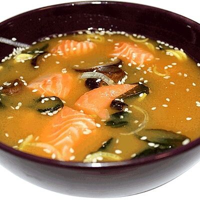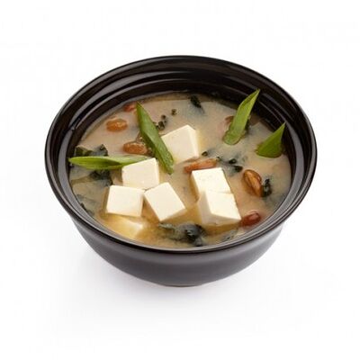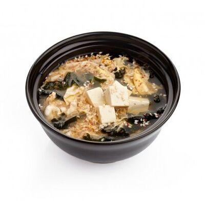 Традиционный острый японский суп с творогом тофу, куриным яйцом, украшенный ароматным кунжутом