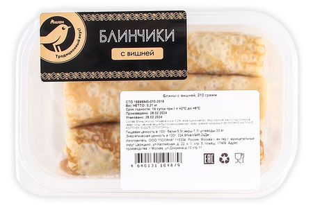 Блины АШАН Золотая птица блюдо для ценителей домашней кухни. Ароматная начинка, завернутая в нежное тесто, придется по вкусу как взрослым, так и детям. В линейке представлены блины с разным наполнением: мясным фаршем, курицей в сливочном соусе, ветчиной и сыром, творогом, ягодным вареньем и творогом. Просто разогрейте и наслаждайтесь вкусным обедом дома или на работе!Состав: Блины (молоко питьевое м.д.ж. 3,2%, мука пшеничная в/с, яйцо куриное, масло подсолнечное, сахар, соль), начинка (вишня быстрозамороженная, сахар, крахмал кукурузный).