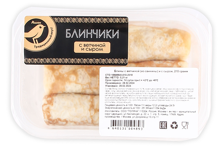 Блины АШАН Золотая птица блюдо для ценителей домашней кухни. Ароматная начинка, завернутая в нежное тесто, придется по вкусу как взрослым, так и детям. В линейке представлены блины с разным наполнением: мясным фаршем, курицей в сливочном соусе, ветчиной и сыром, творогом, ягодным вареньем и творогом. Просто разогрейте и наслаждайтесь вкусным обедом дома или на работе!Состав: Блины (молоко питьевое м.д.ж. 3,2 %, мука пшеничная в/с, яйцо куриное, масло подсолнечное, сахар, соль), начинка (ветчина (свинина, вода, соль, клетчатка лимонная, сахар, стабилизатор - цитрат натрия, антиокислитель - аскорбиновая кислота, специи (имбирь молотый, кориандр молотый, лук репчатый сушеный, перец белый молотый, чеснок сушеный), экстракт мускатного ореха), сыр Гауда м.д.ж. в сухом вещ-ве 45% (молоко пастеризованное, молоко обезжиренное пастеризованное, закваска молочнокислых бактерий, соль, краситель аннато, сычужный фермент животного происхождения, уплотнитель - хлорид кальция).