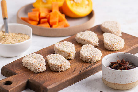Овощные наггетсы с нежным, сладковатым вкусом из свежей тыквы, моркови и овсяных хлопьев. Снаружи покрыты панировочными сухарями, которые при обжаривании образуют хрустящую золотистую корочку. Мы создавали продукт и для взрослых, и для малышей, поэтому добавили совсем немного специй — паприку и хмели-сунели. Обжарьте на сильном огне по 3 минуты с каждой стороны, потом ещё 5 — на среднем, и наггетсы готовы!