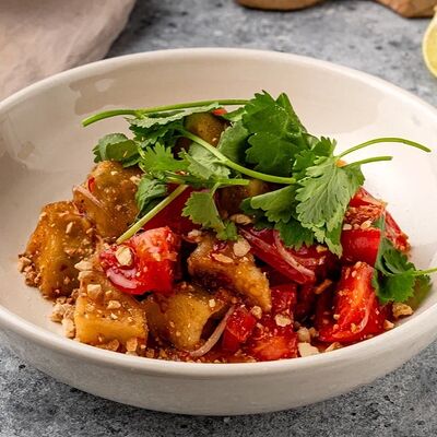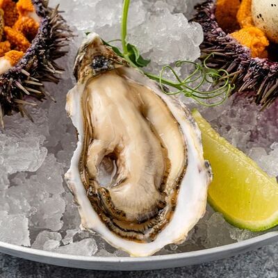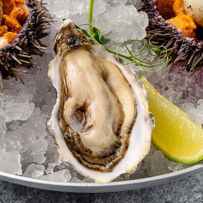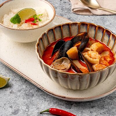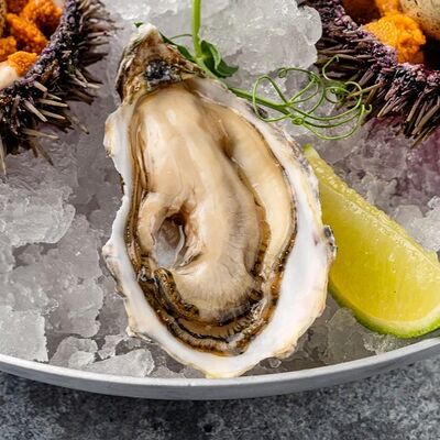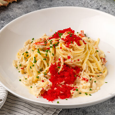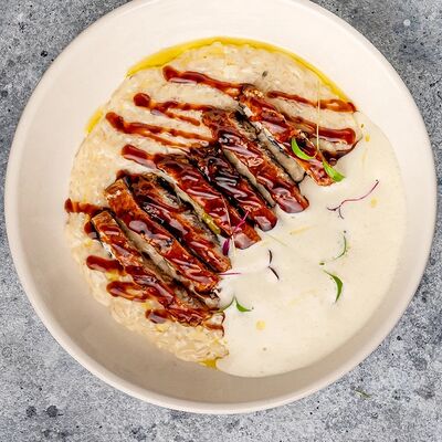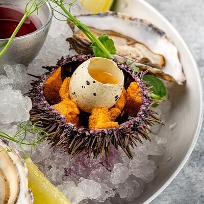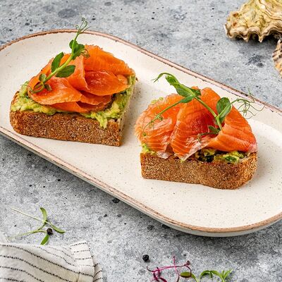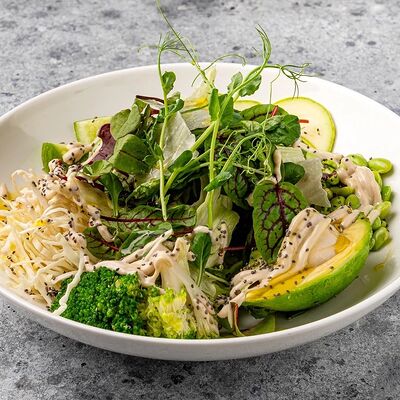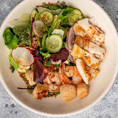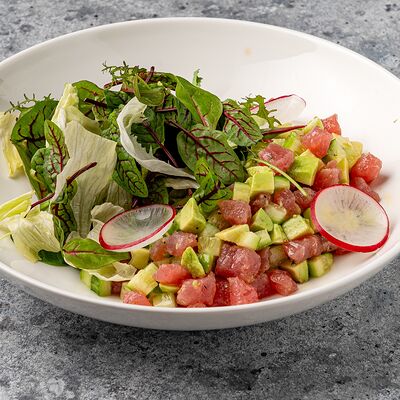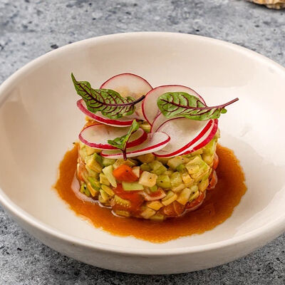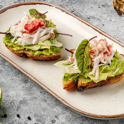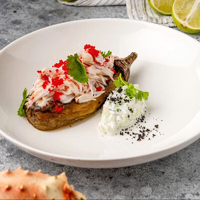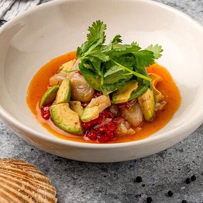 Сахалинский гребешок, авокадо, малина, кинза, соус харисса, лук маринованный