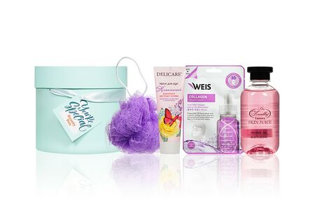 Женский подарочный набор ( гель для душа Liss Kroully 270мл + крем для рук Delicare " комплексный " 75мл + маска для лица WEIS " collagen " 23г + мочалка для тела Aqua Joy фиолетовая ) доставка