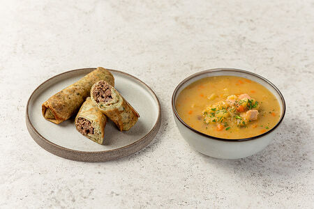 Набор: Суп гороховый с копченостями, + блины с печенью доставка