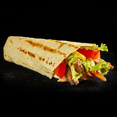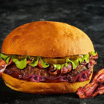 Булочка пшеничная, соус барбекю, огурцы маринованные, салат айсберг, бекон, мармеладный лук, котлета говяжья