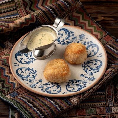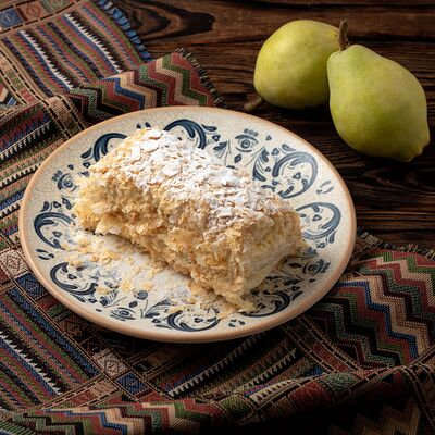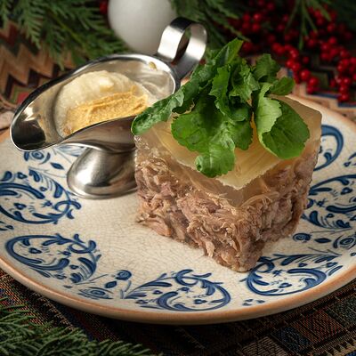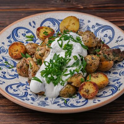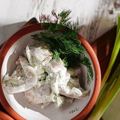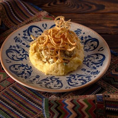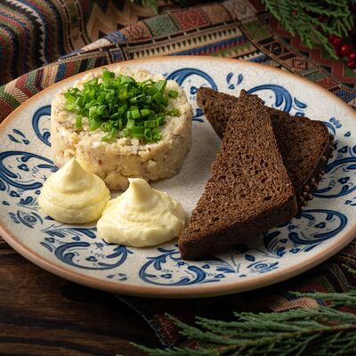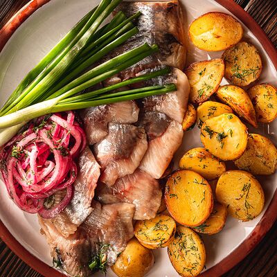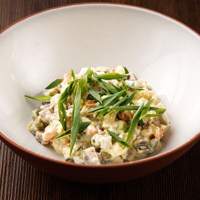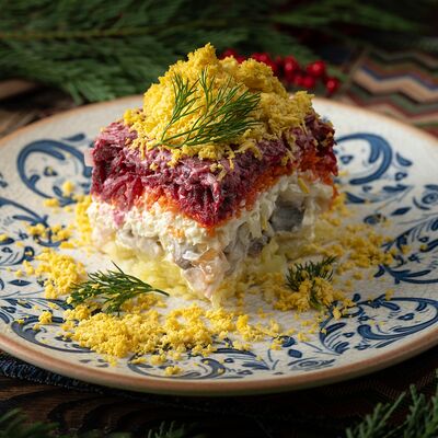 Печеный картофель, сельдь филе, лук репчатый, морковь печеная, свекла фермерская печеная, домашний майонез, украшается тертым желтком и соцветием укропа
