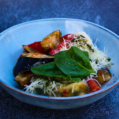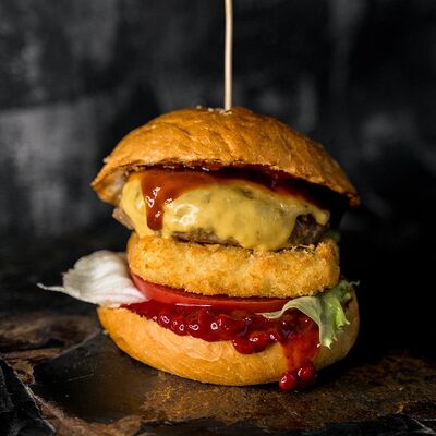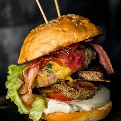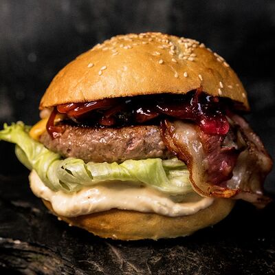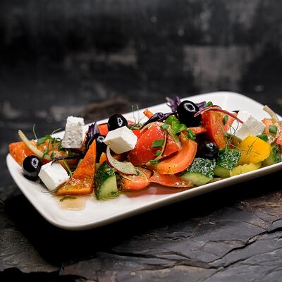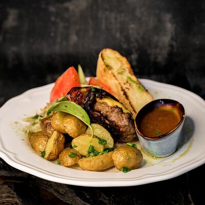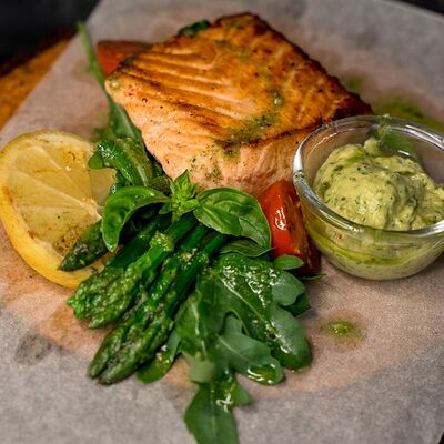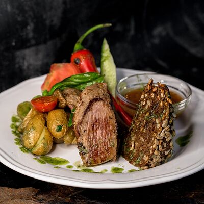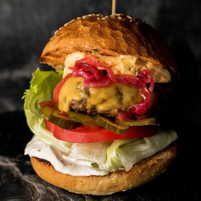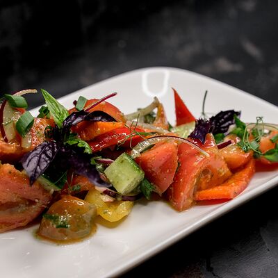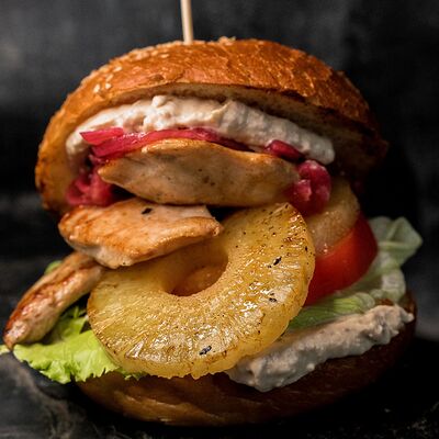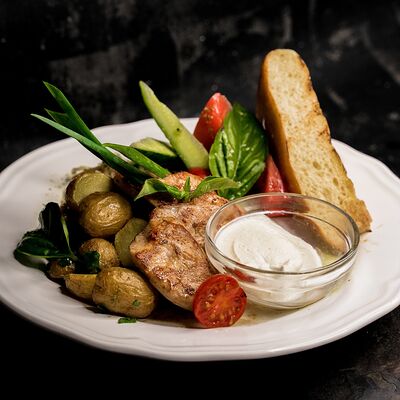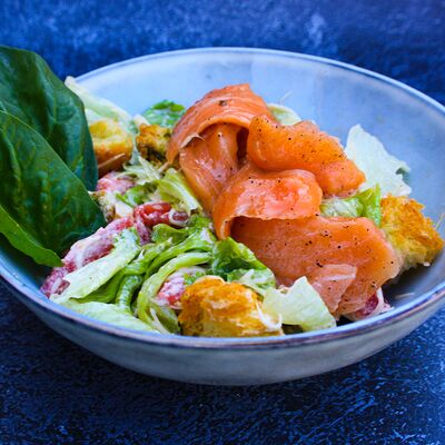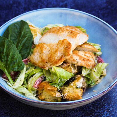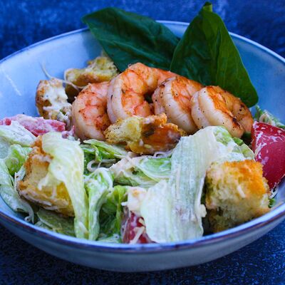 Классический цезарь с куриным филе, обжаренным на гриле, салатом айсберг, помидором, сыром пармезан, сухариками и заправкой