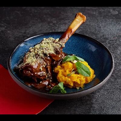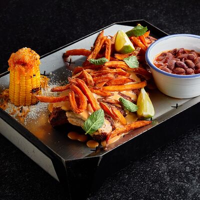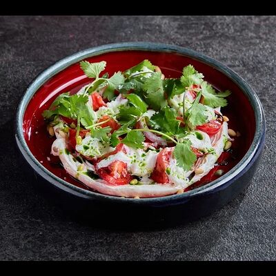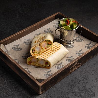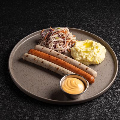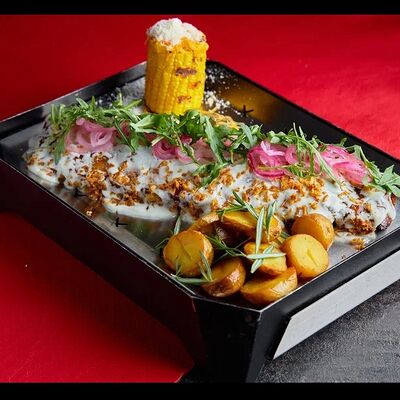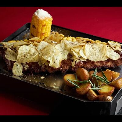 Булочка собственного приготовления, говяжья котлета, кетчуп, маринованные огурцы, салат айсберг, красный лук, сыр чеддер, помидоры