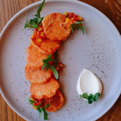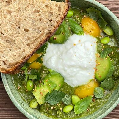 Глазунья в пряном соусе из томатов, болгарского перца, кинзы, тофу