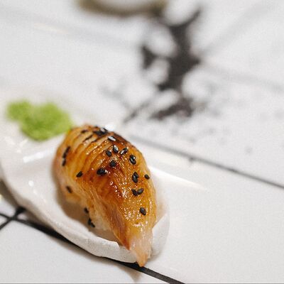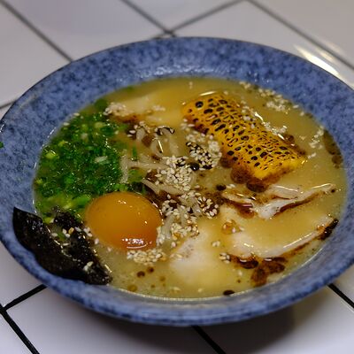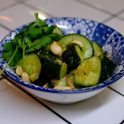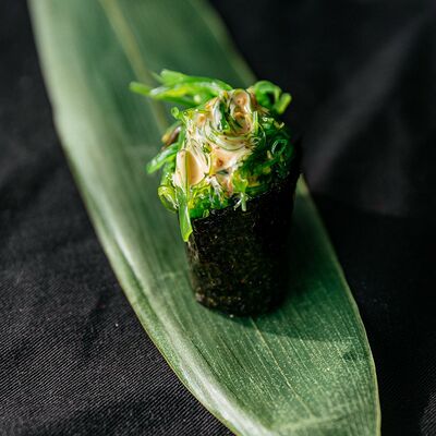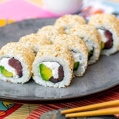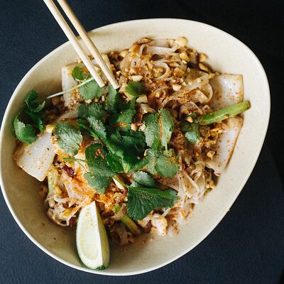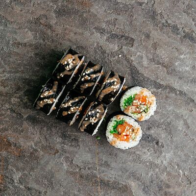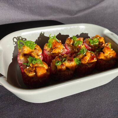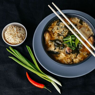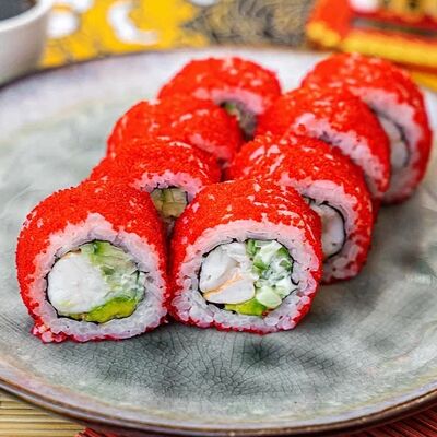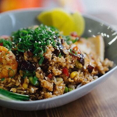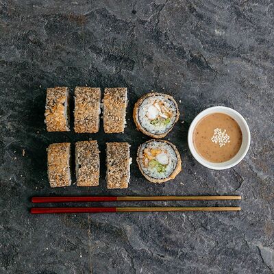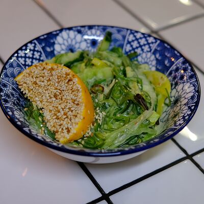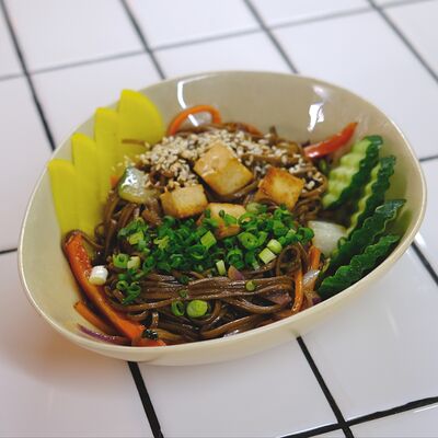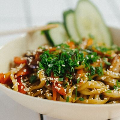 Лапша удон самолепная, лук красный и зелёный, морковь, перец болгарский, огурец, редька дайкон, кунжут
