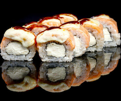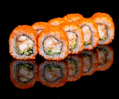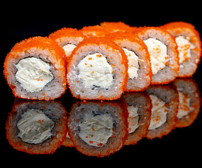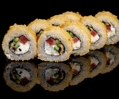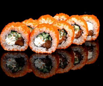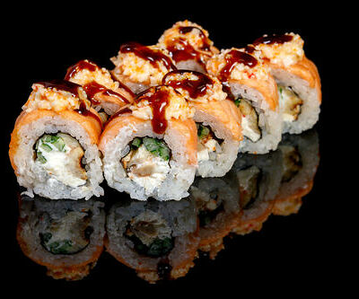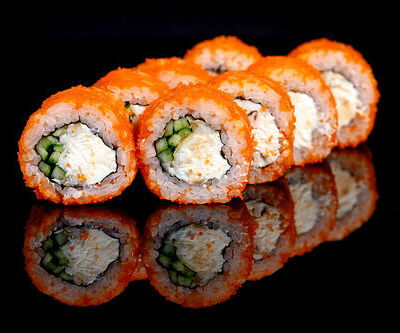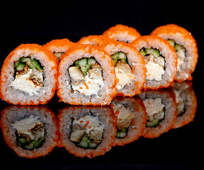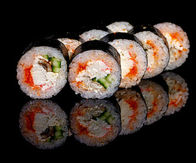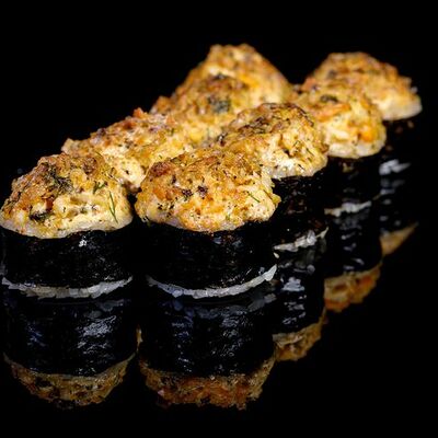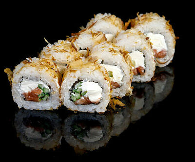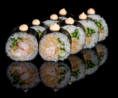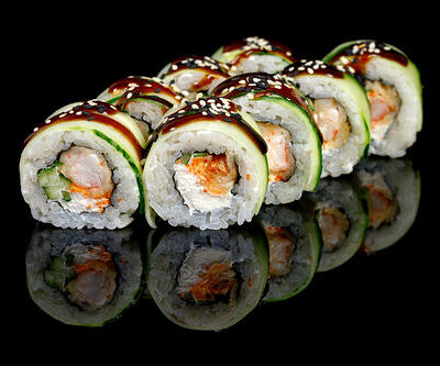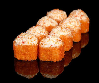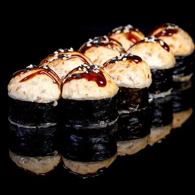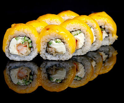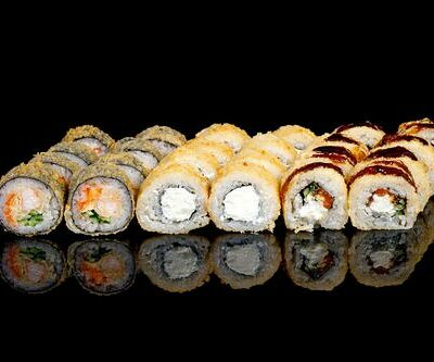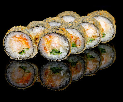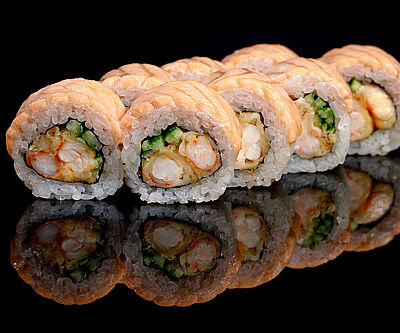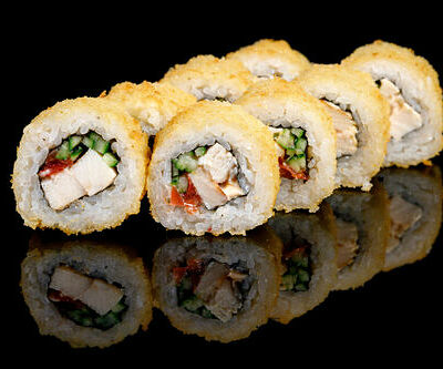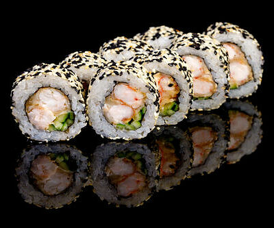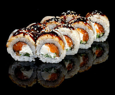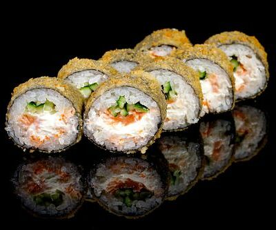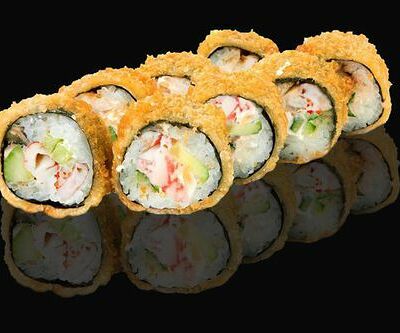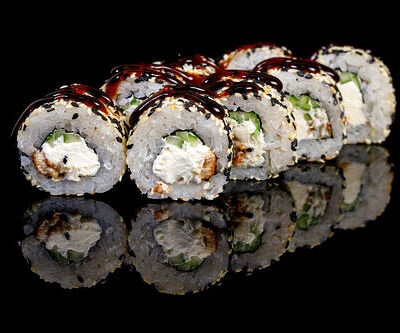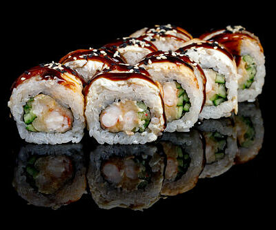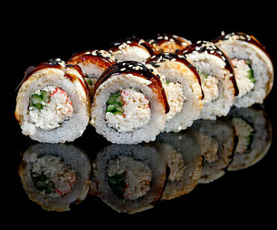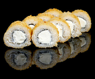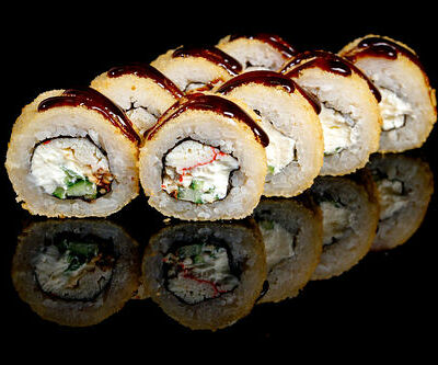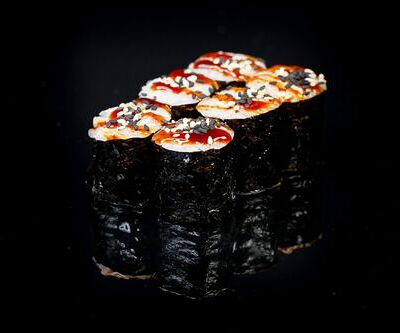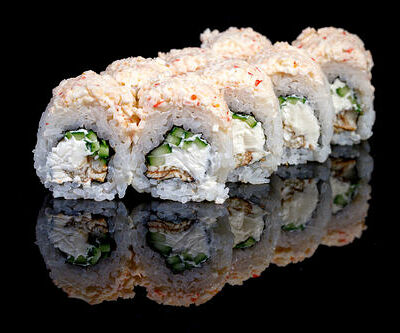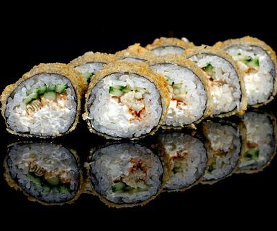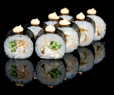 300 гр Рис, нори, угорь, креветка в кляре, огурец, сливочный сыр, кляр, сухари, соус унаги