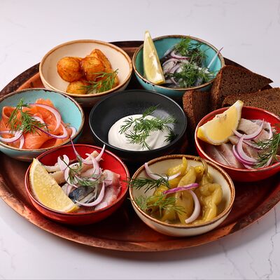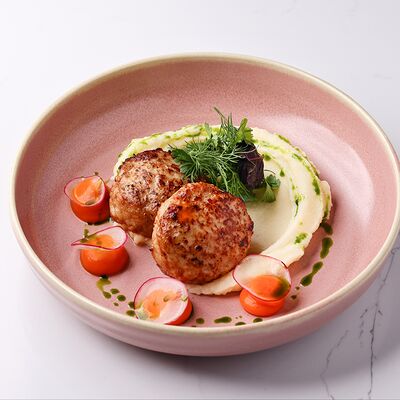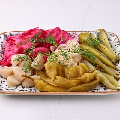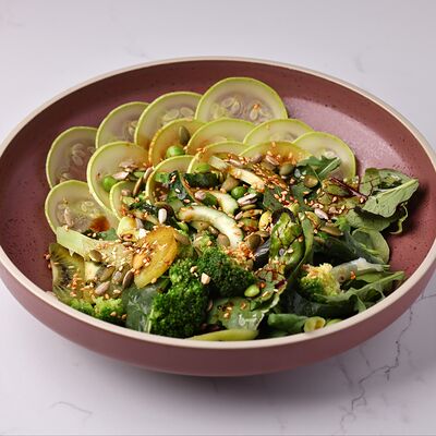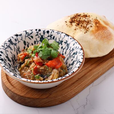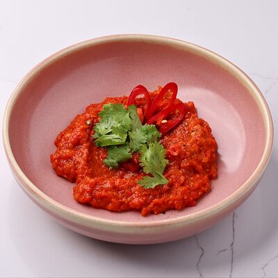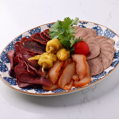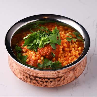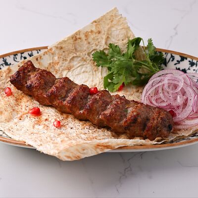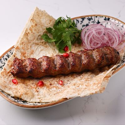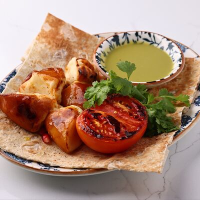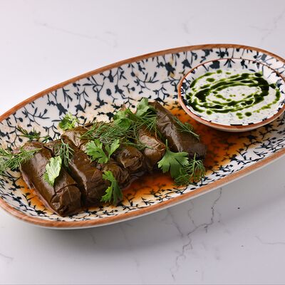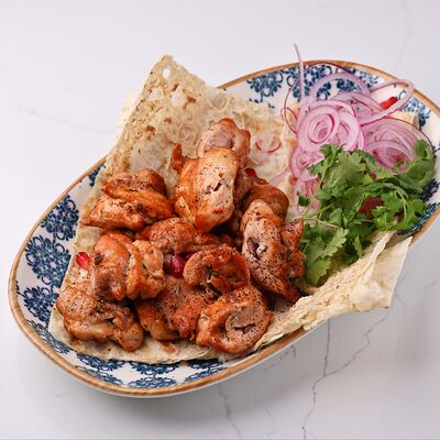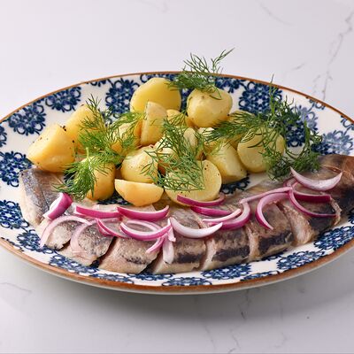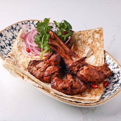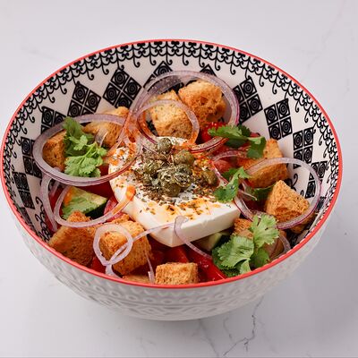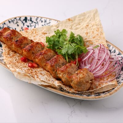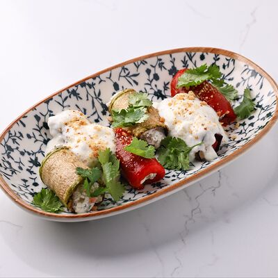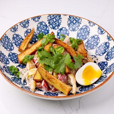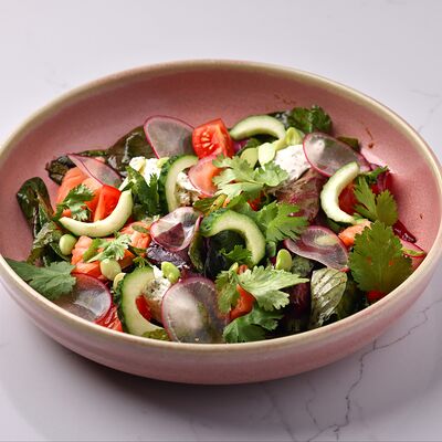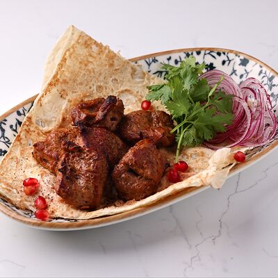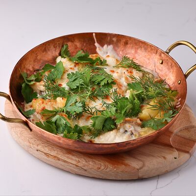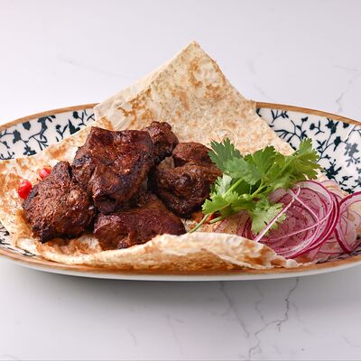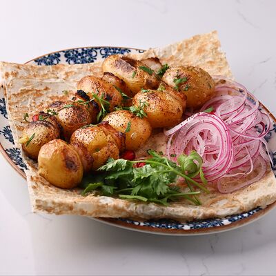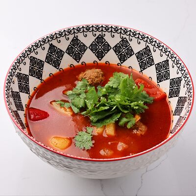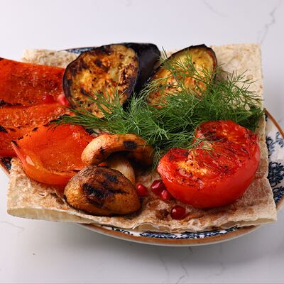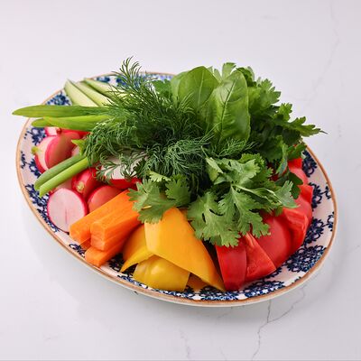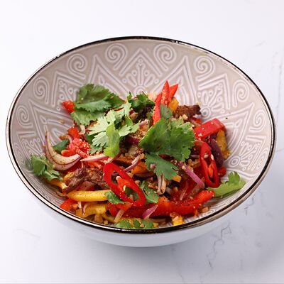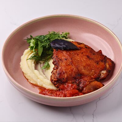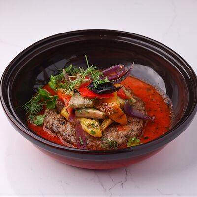 Томленая баранья голень с овощами (лук, болгарский перц, томаты, картофель.) с добавлением ялтинского лука и миксом зелени