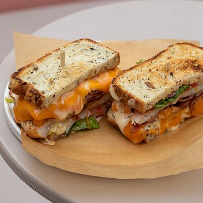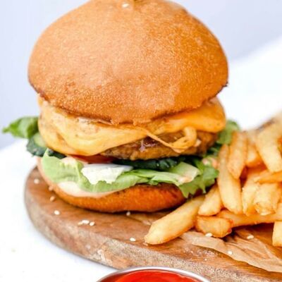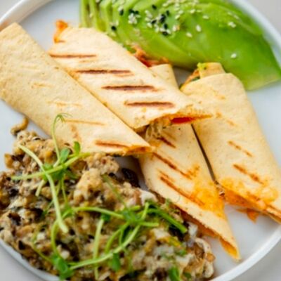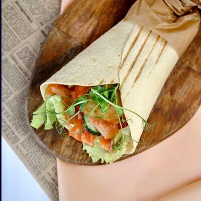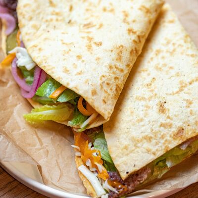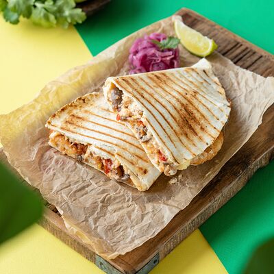 Очень сытный вариант тортильи в лучших мексиканских традициях, сырная тортилья, фарш из говядины, сыр моцарелла, соленые огурцы, маринованный красный лук, салат айсберг и соус гриль