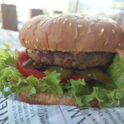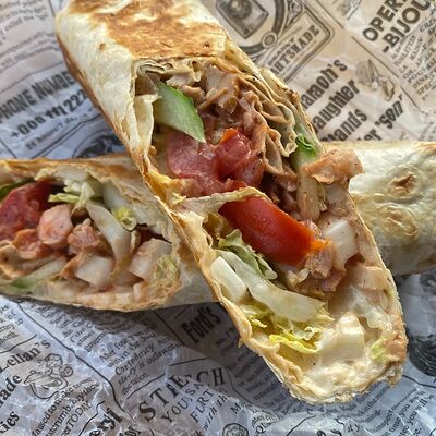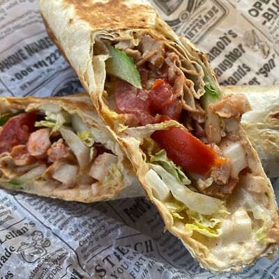 Пита, мясо курицы, картофель фри, лист салата, помидор, лук фиолетовый, соус тартар (от нашего шеф-повара)