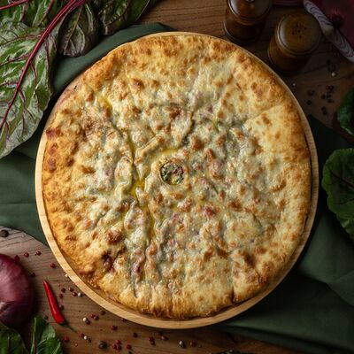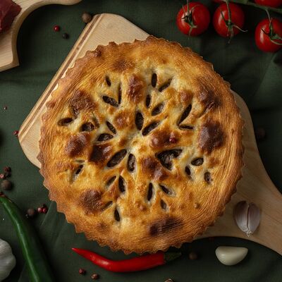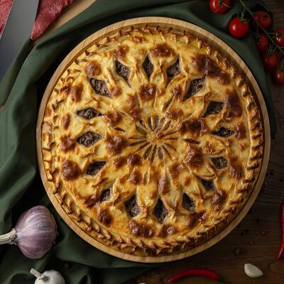 Бездрожжевое тесто, мякоть говядины, лук, перец, сливочное масло