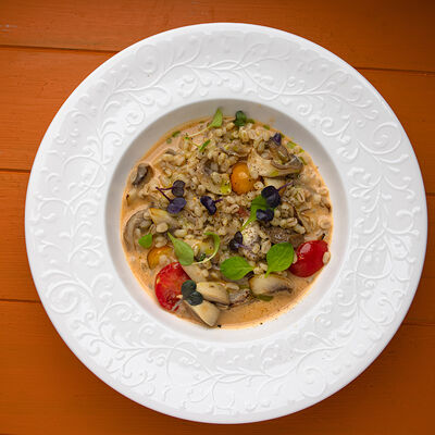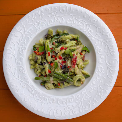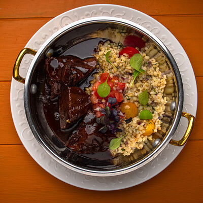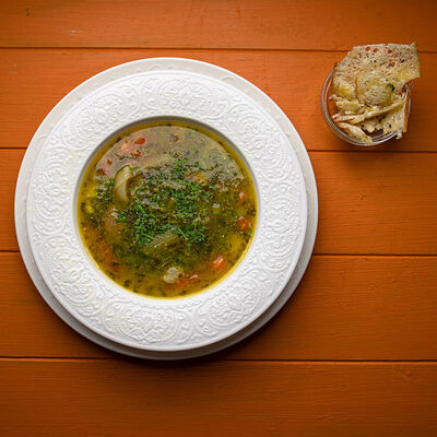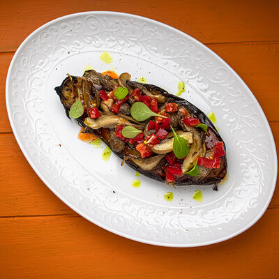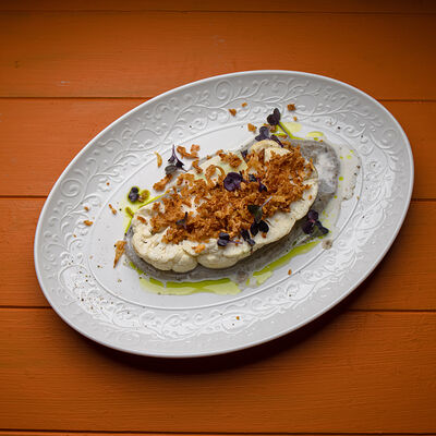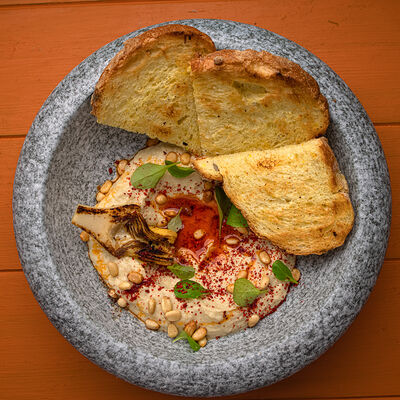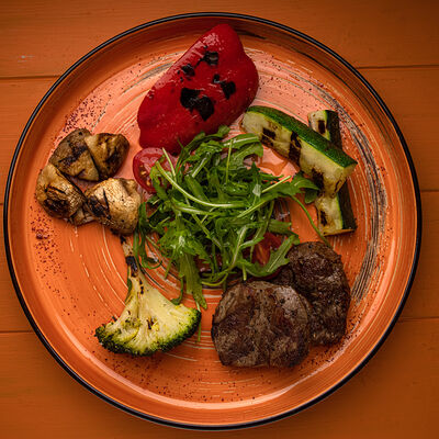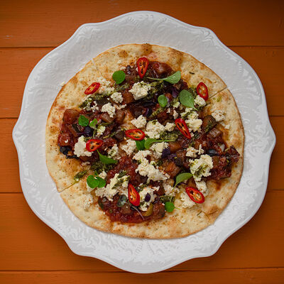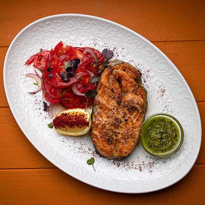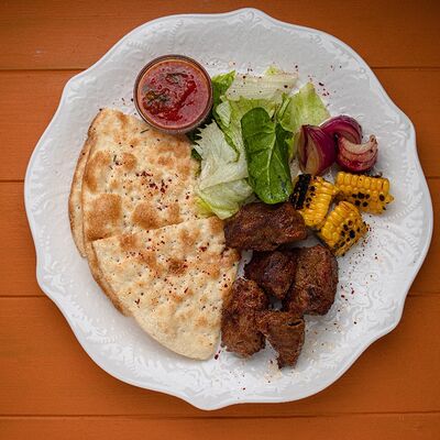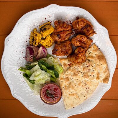 Куриное бедро в маринаде из майонеза, паприки и чеснока, фокачча, кукуруза гриль, маринованный красный лук, кинза и домашняя аджика