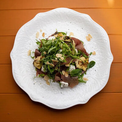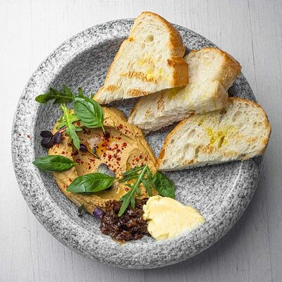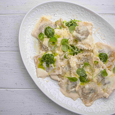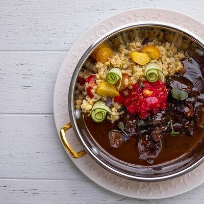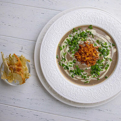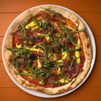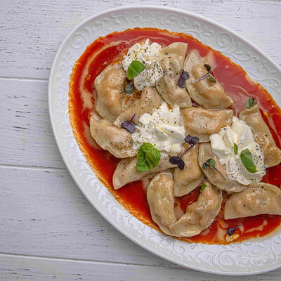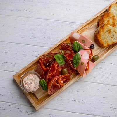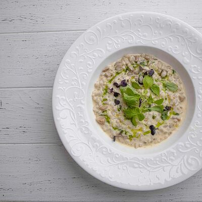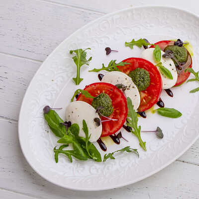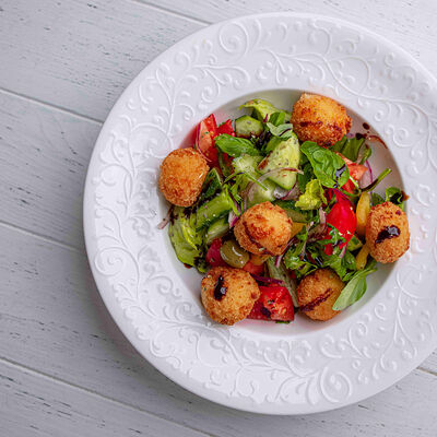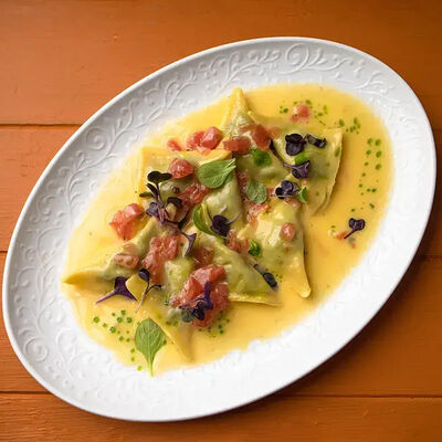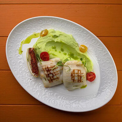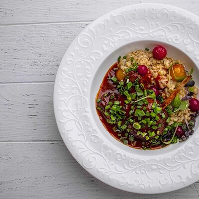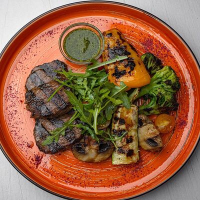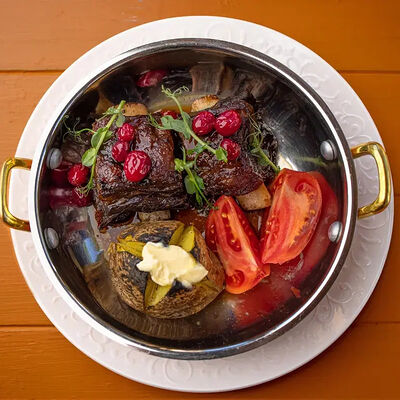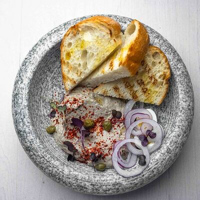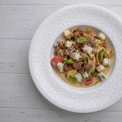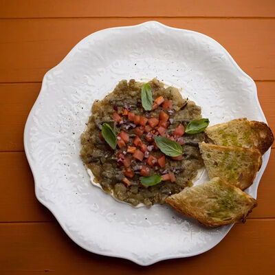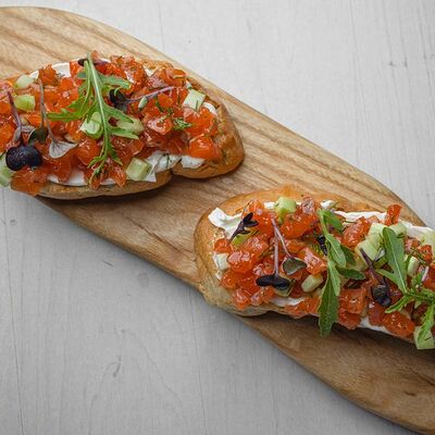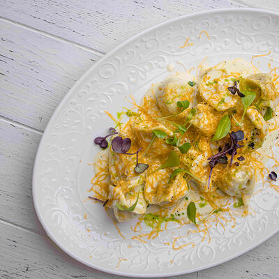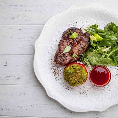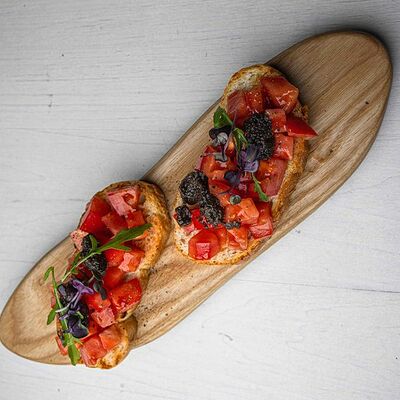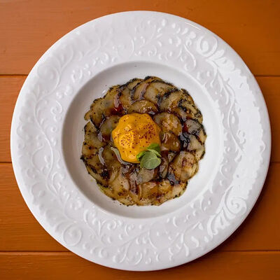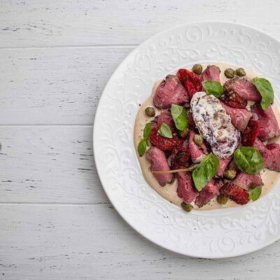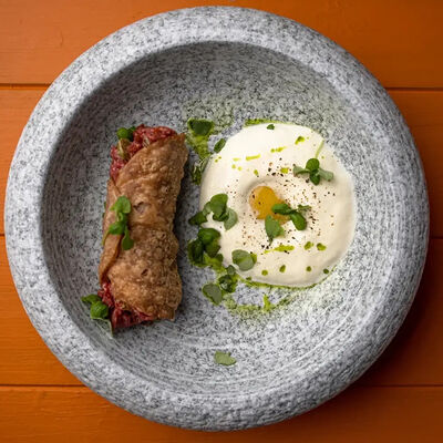 Тартар из говяжьей вырезки с каперсами, вялеными томатами, заправленный оливковым маслом, перед подачей дополняем желтком перепелиного яйца, зеленым маслом и микро зеленью подаем с коннолли с начинкой из мусса из пармезана (сливки, пармезан)